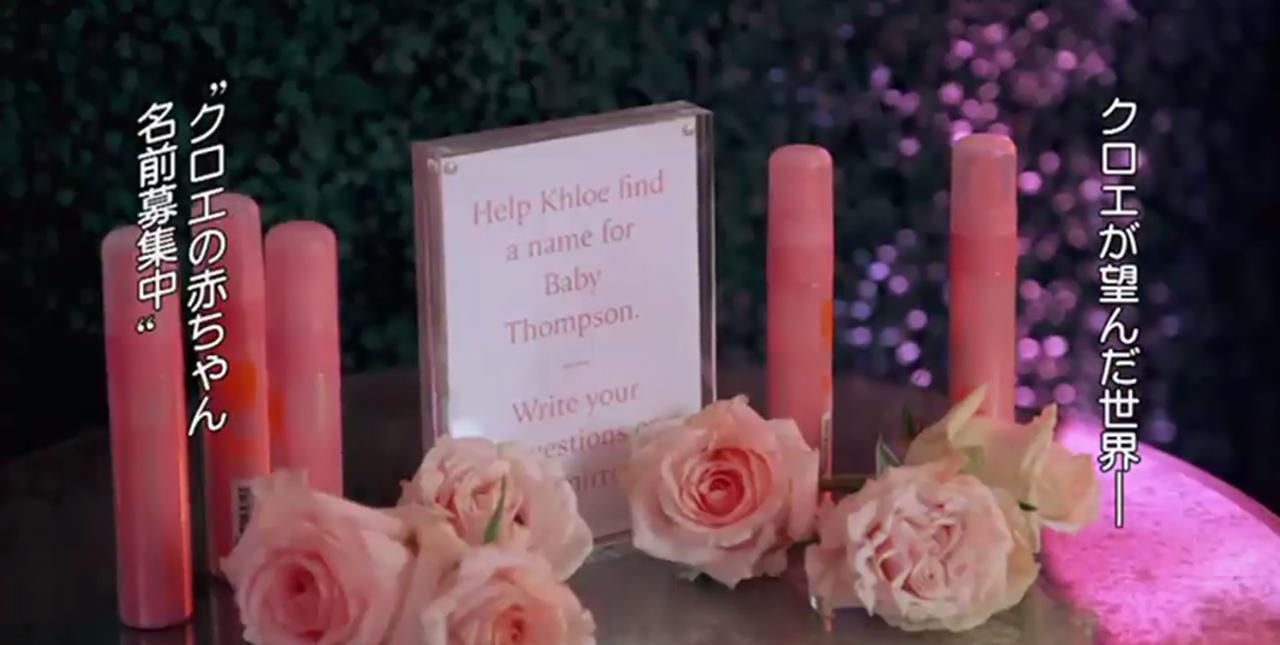 ピンク色のマーカーで次々と書かれた名前がパーティーの飾りのひとつへと変化していくなか、次女のキム・カーダシアンが祖父の名前であるトゥルー(True)という名前を書き、実際にこれがクロエの娘トゥルーちゃんの名前になった。
