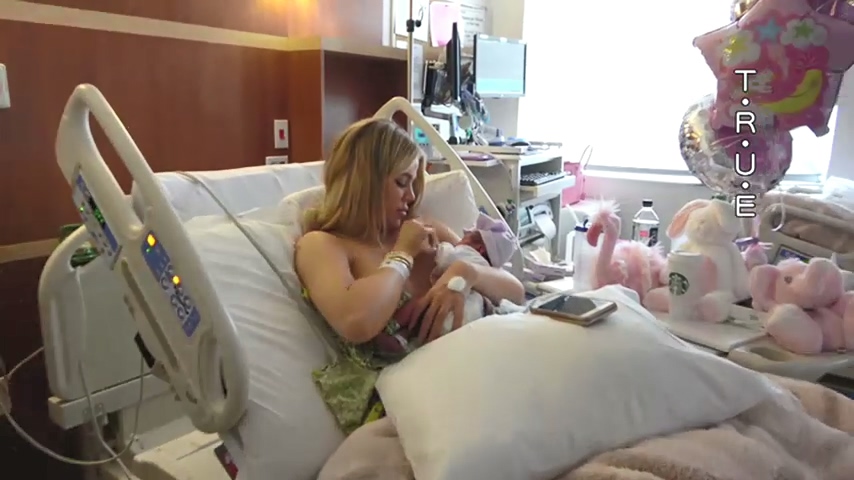 生まれたばかりの娘トゥルーちゃんを抱くクロエ。