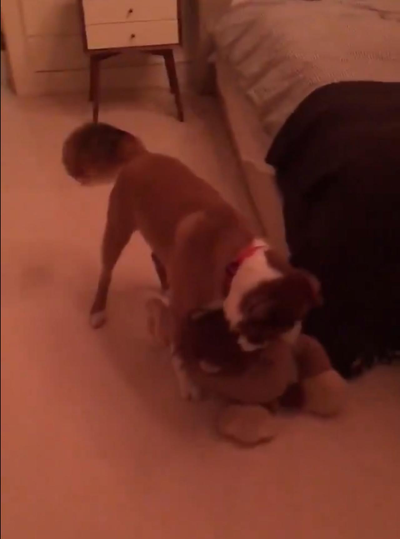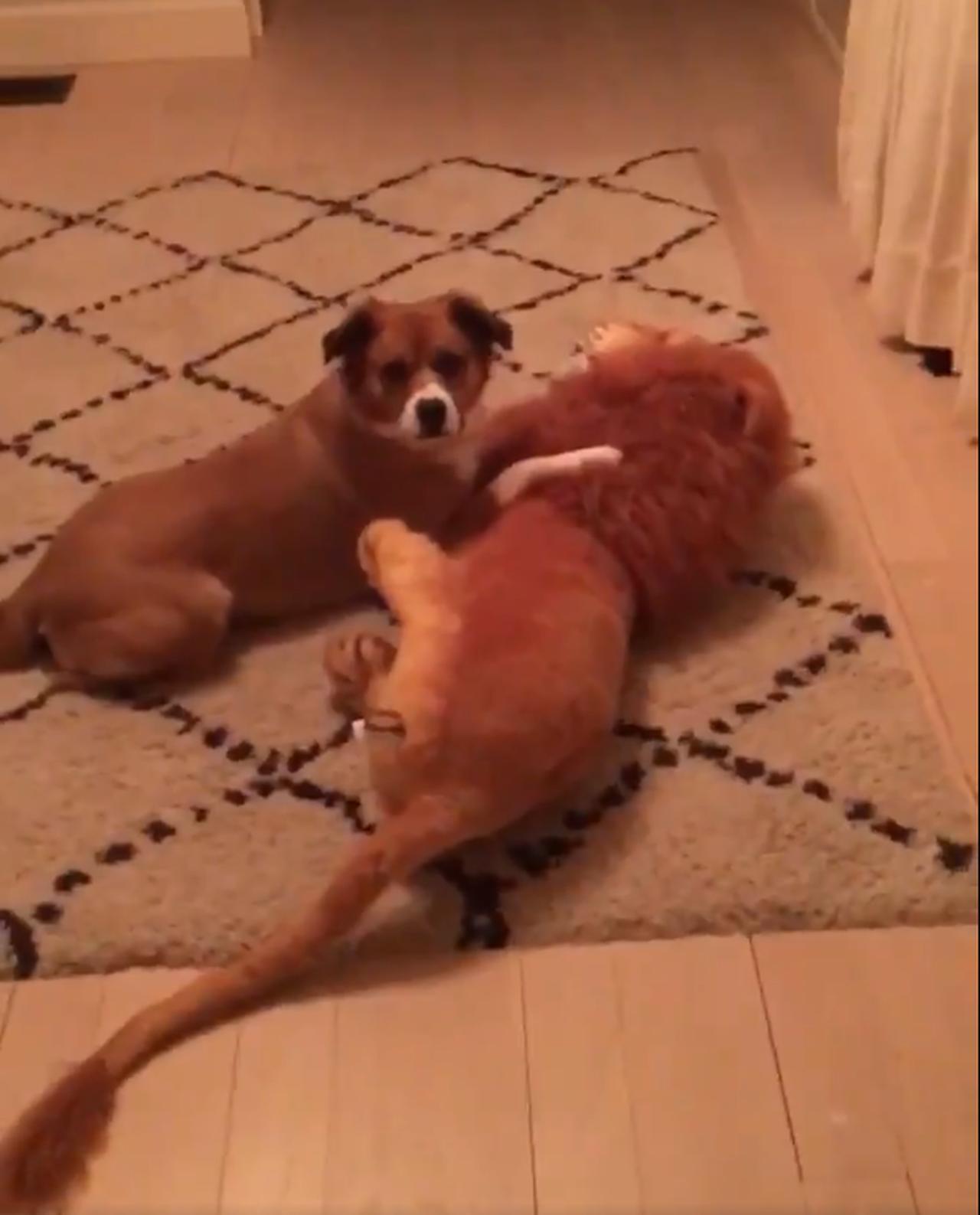 ちなみに動画の終盤には、2つのライオンのぬいぐるみを手にしたドジャーが、さっそく新しいライオンと戯れているところから、どちらかのぬいぐるみを連れて寝室に行くまでのクリスとドジャーのほっこりするやり取りが映されている。