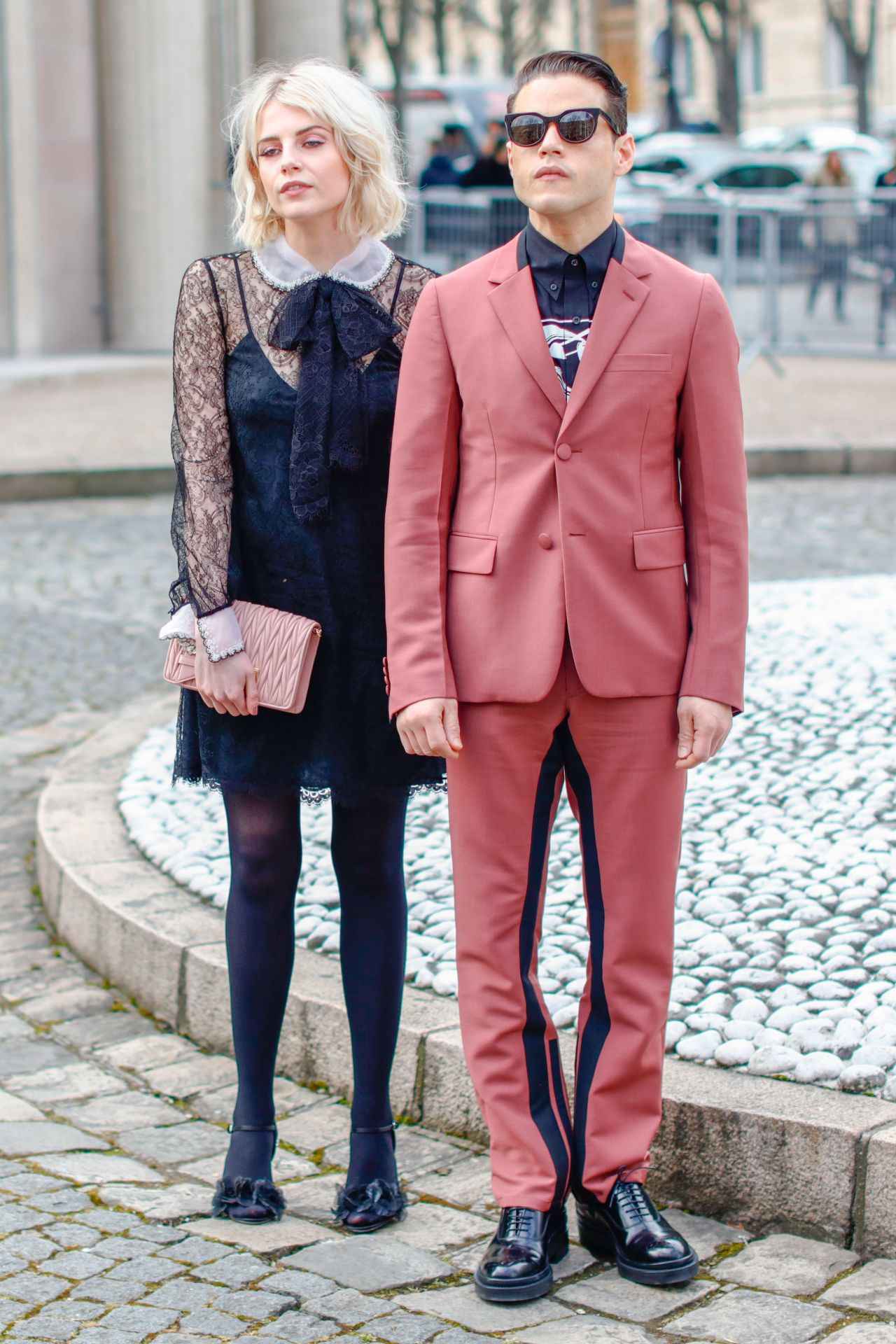 日頃からキュートなスタイルを好むルーシー・ボイントンは、ラミと同じブランドのミュウミュウのレーシーなワンピースで乙女なルックに仕上げ、ピンクをリンクしたカップルコーデに。