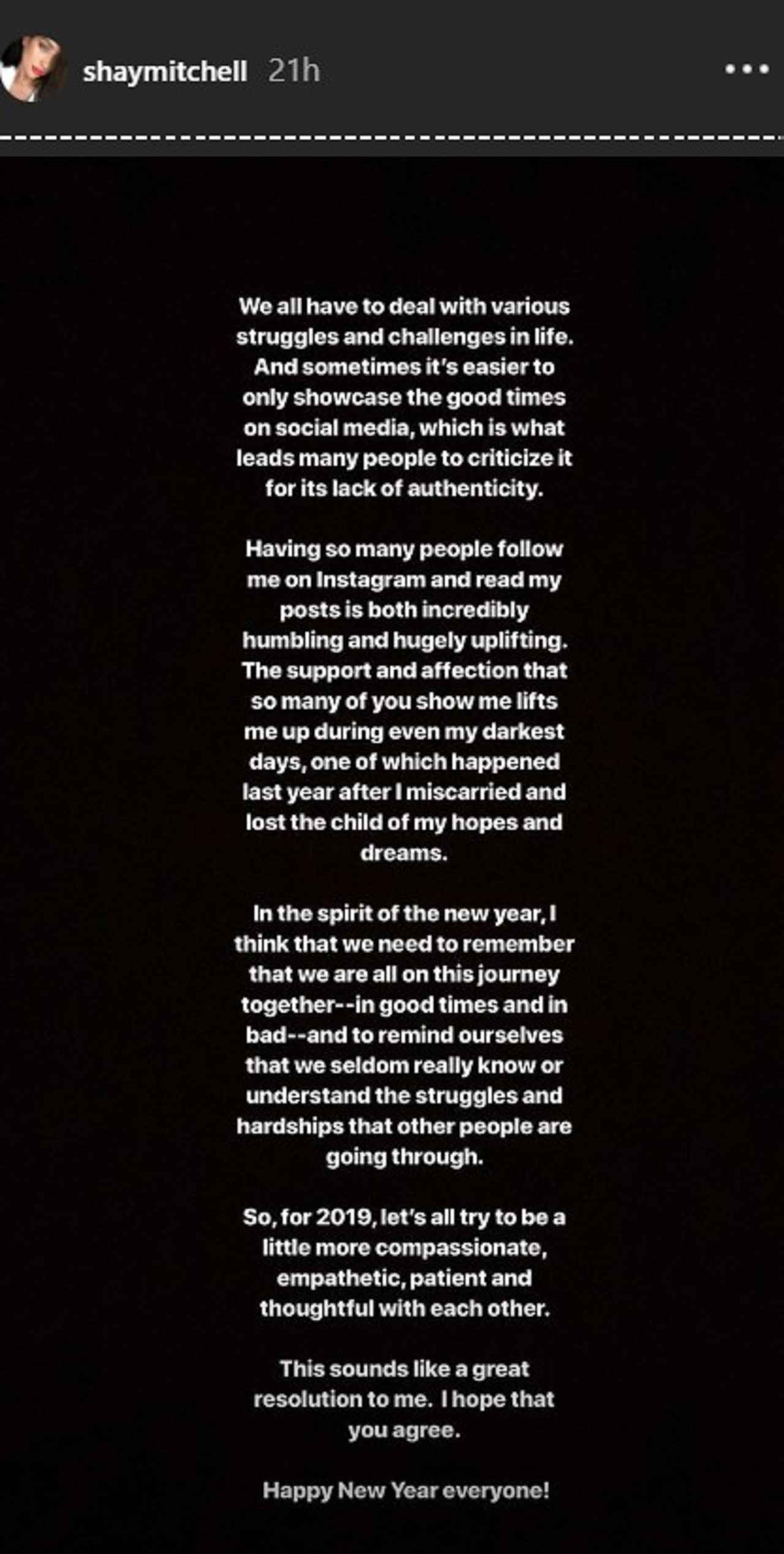 2019年の年明けを日本で迎えたドラマ『プリティ・リトル・ライアーズ』の女優シェイ・ミッチェル(31)が、2018年内に流産を経験していたことを初告白した。
