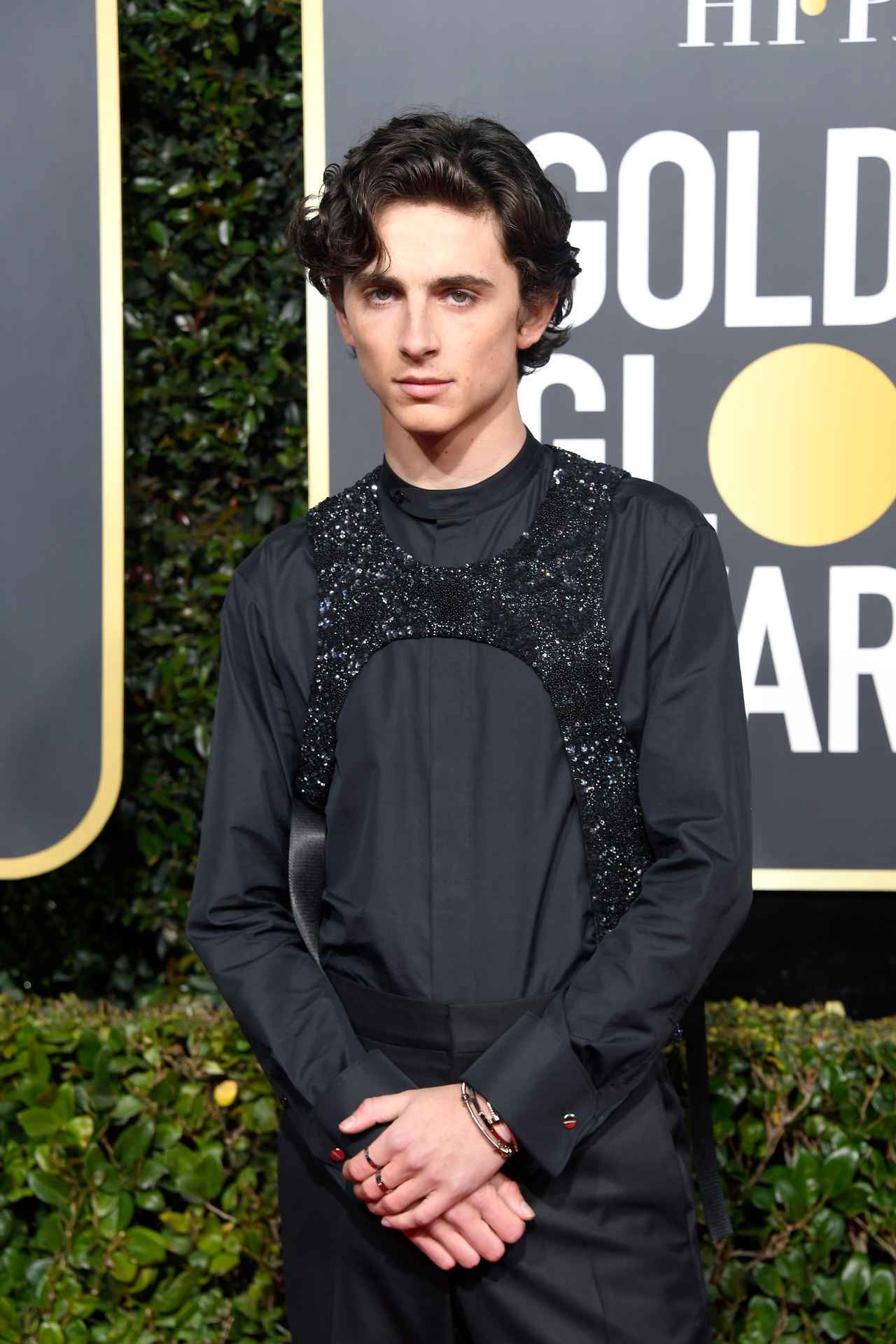 アワードシーズン開幕の1発目ということで、大きな話題を集めたゴールデン・グローブの授賞式には豪華なセレブが勢ぞろい。アワードということで、男性セレブたちはスーツに身を包むことが多いけれど、映画『君の名前で僕を呼んで』に出演し、薬物依存症に苦しむ少年役を演じた映画『ビューティフル・ボーイ』に出演するティモシー・シャラメは個性派な衣装で登場し、レッドカーペットで視線を集めた。その姿はこちら。