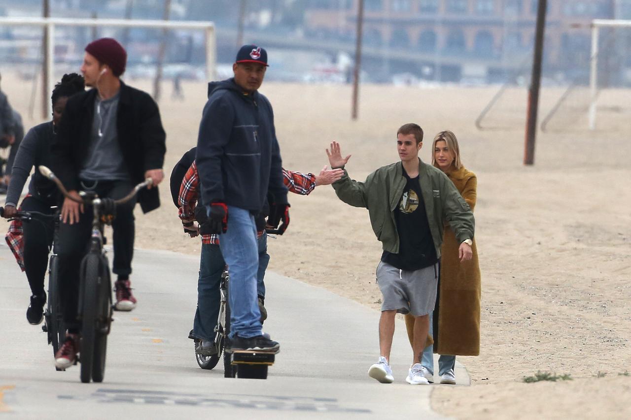 この日、ほとんど手ぶらでビーチに現れたジャスティンとヘイリーは、舗装されたビーチ沿いの歩道を歩きながら、お金のかからない“0円デート”をエンジョイ。