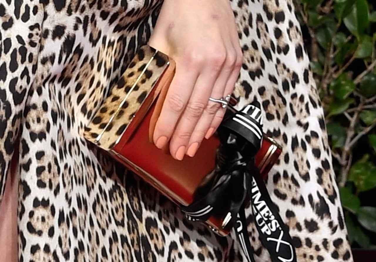 セレブがレッドカーペットで愛用することでも知られるジミー チュウの“J BOX”クラッチバッグは、その名の通りボックス型のスタイリッシュなクラッチ。さらにアンは、「Time’s Up×2」とプリントされたリボンをバッグにアクセサリーのように着けたことでさらに注目を浴びた。