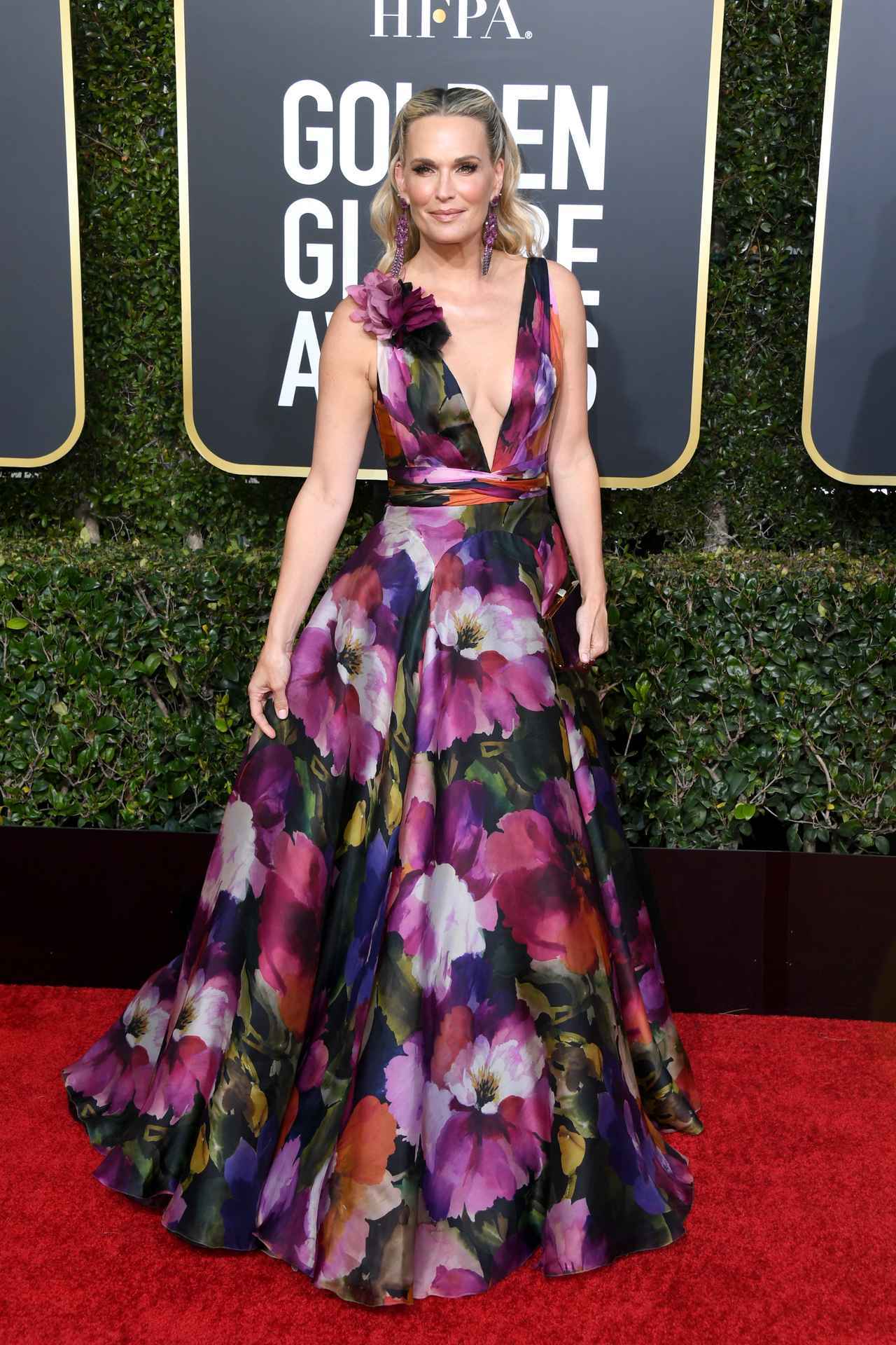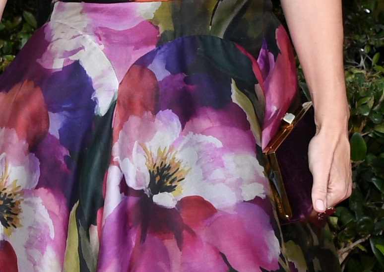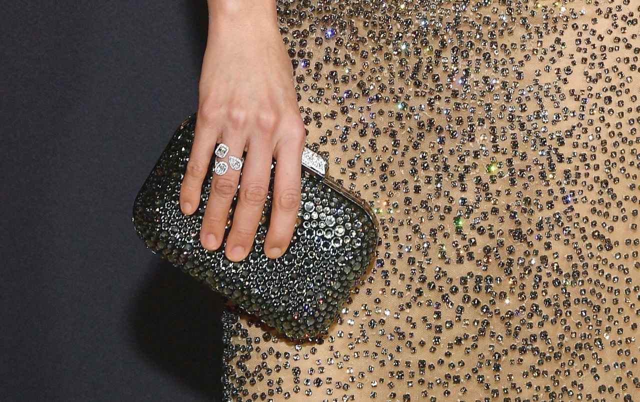 女優のモリー・シムズは、深いVラインがセクシーなプランジングネックのドレスに、ジミー チュウの“CELESTE”クラッチバッグを合わせて。