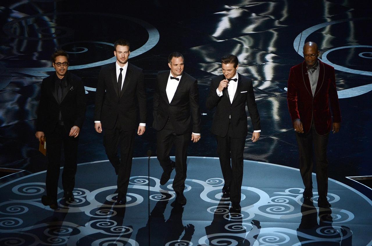 プレゼンターとして第85回アカデミー賞のステージに登場した『アベンジャーズ』のキャストたち。左からロバート・ダウニー・Jr.、クリス・エヴァンス、マーク・ラファロ、ジェレミー・レナ―、サミュエル・L・ジャクソン。
