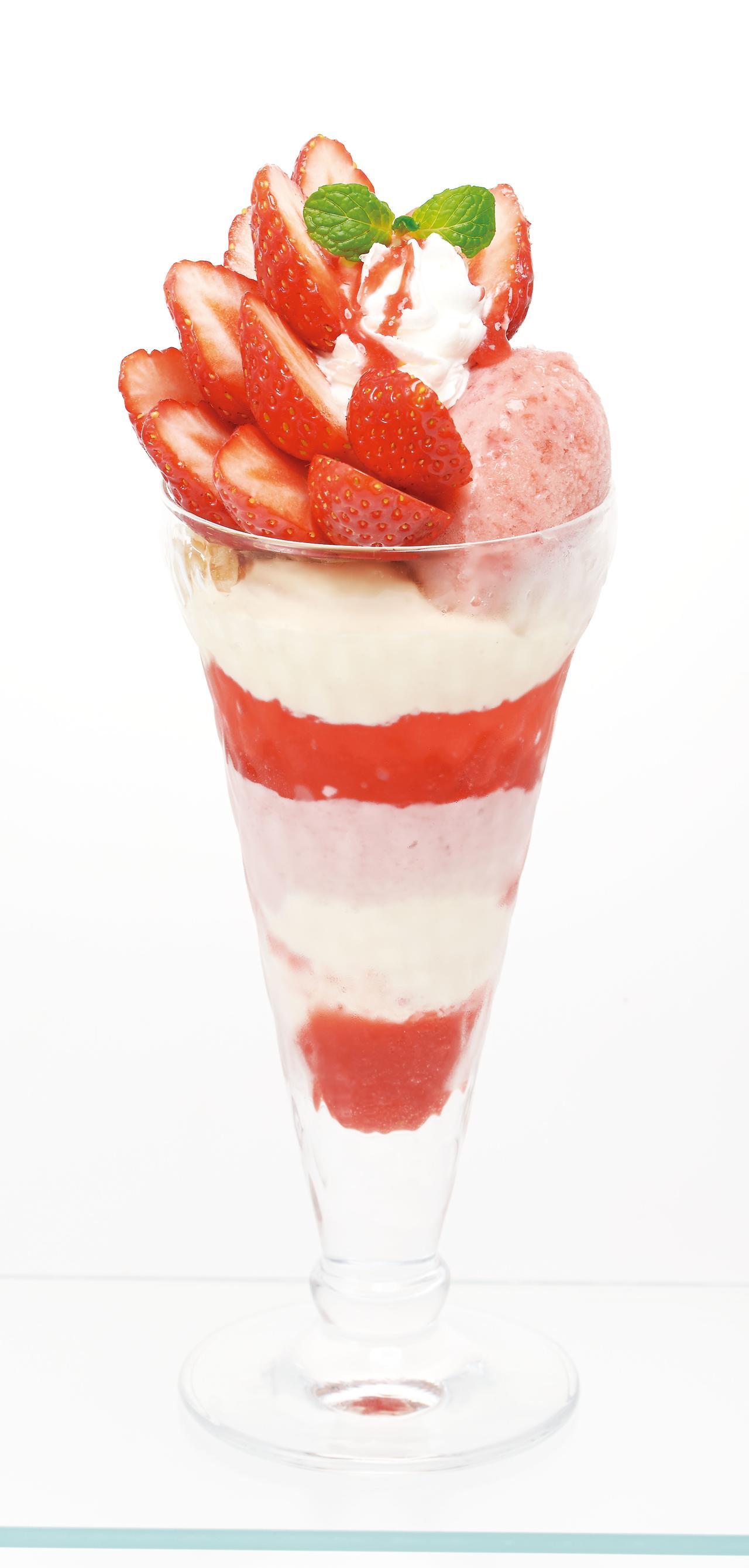 グラスの中に重ねた苺ソースや苺クリーム、苺ゼリー、苺ソルベなど、様々な素材に変身した苺が、フレッシュの苺の美味しさを引き立てる。赤、白、ピンクと、色とりどりに重ねられた素材はどれも相性が良く、ひとくちごとに違った味わいが楽しめる。