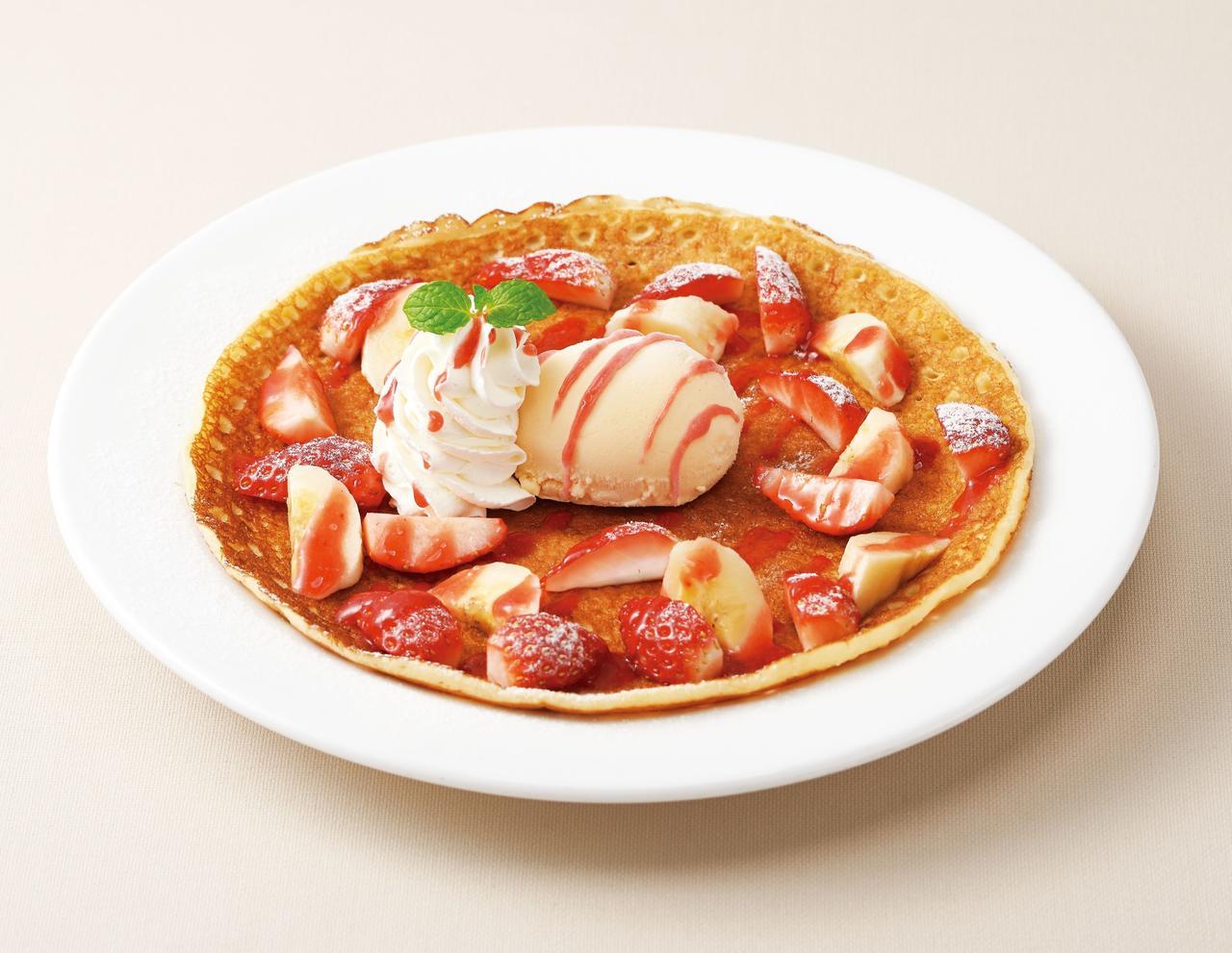 店舗で1枚1枚丁寧に焼き上げたバターが香るガレットに、苺、バナナ、アイス、ホイップクリームをトッピング。みずみずしい苺をしっとりとした食感のガレットでくるりと巻く、デニーズの定番の人気スイーツ。