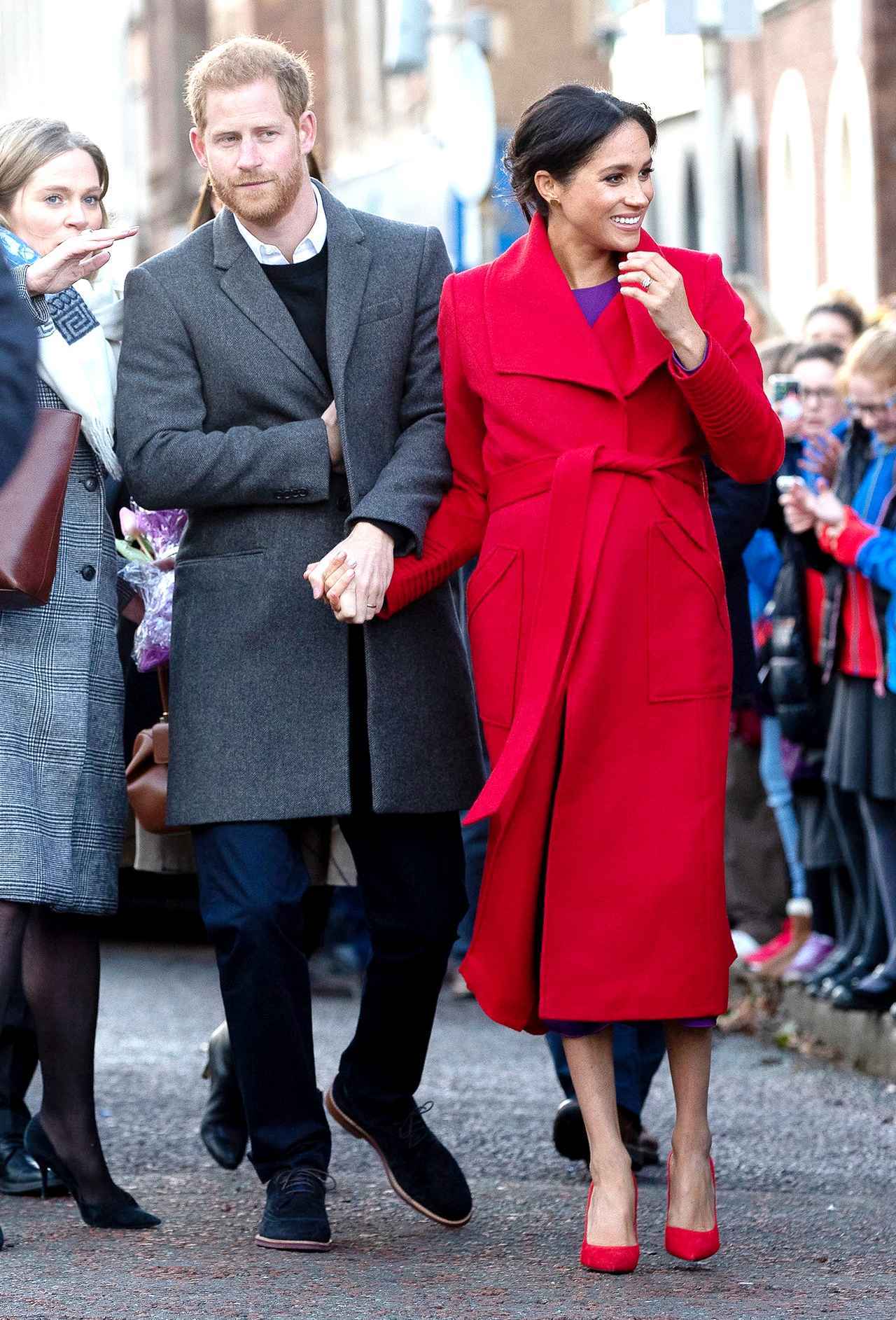 メーガン妃は、パープルのワンピースにレッドのコートを合わせた鮮やかなスタイリングを披露。コートに合わせて、セレブ御用達ブランドとして知られるスチュアート・ワイツマンのレッドカラーのスエードパンプスを合わせ、華やかに登場。現在妊娠中のメーガン妃をつねに気づかいながら、エスコートするヘンリー王子。