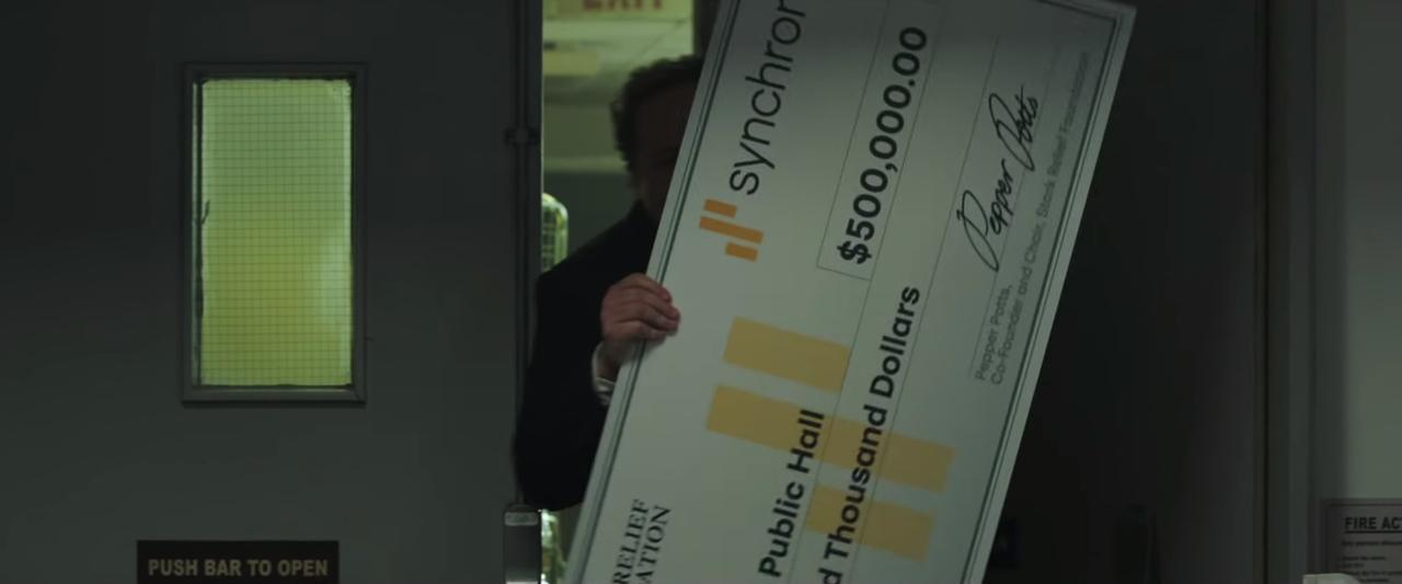 ジョン・ファブロー演じるトニー・スタークの右腕ハッピー・ホーガンが抱える大きな小切手は、アベンジャーズの戦いで被害を受けた人々を支援する団体Stark Relief Foundationのもの。