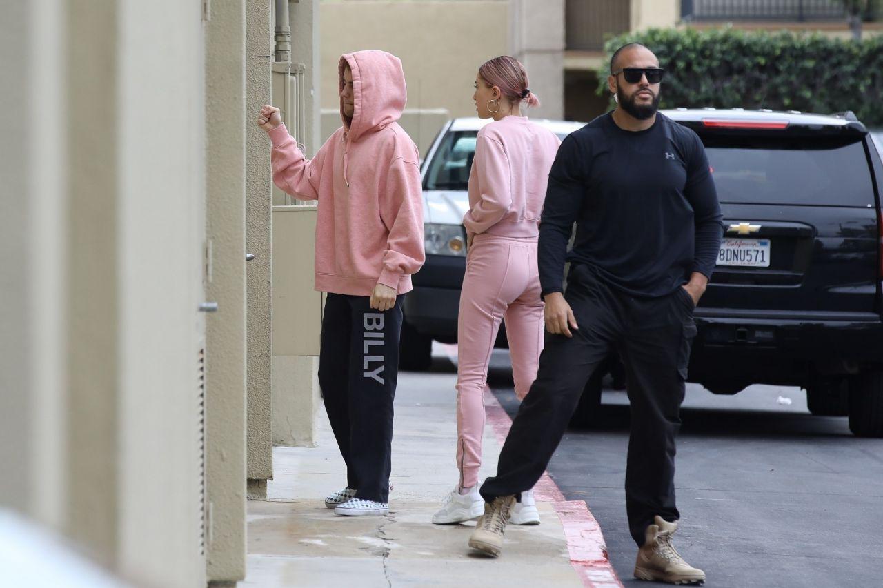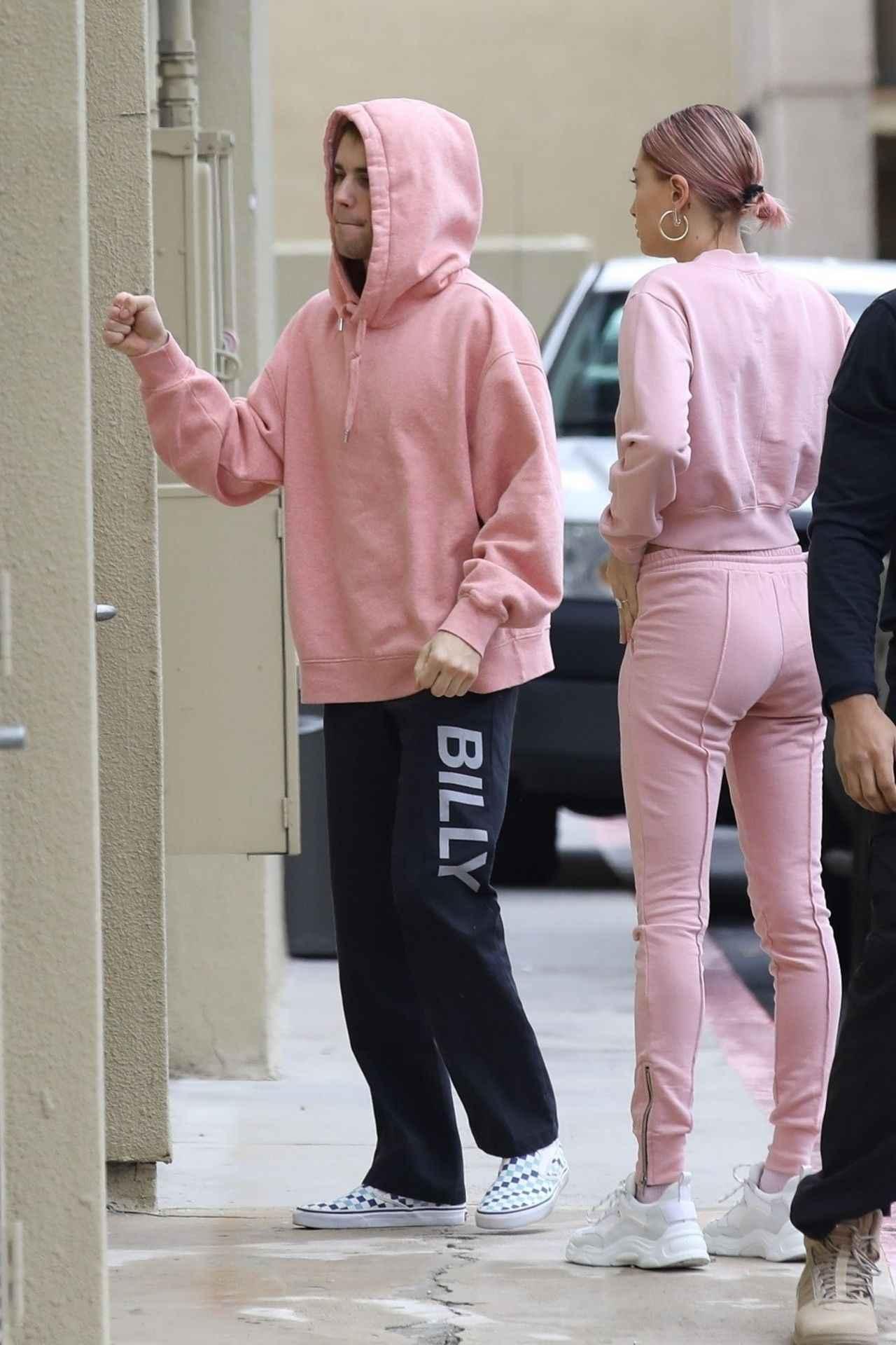 ジャスティン・ビーバーもヘイリーのスタイルに合わせるように、ライトピンクのフーディを選んで、ピンクのカップルコーデを披露!