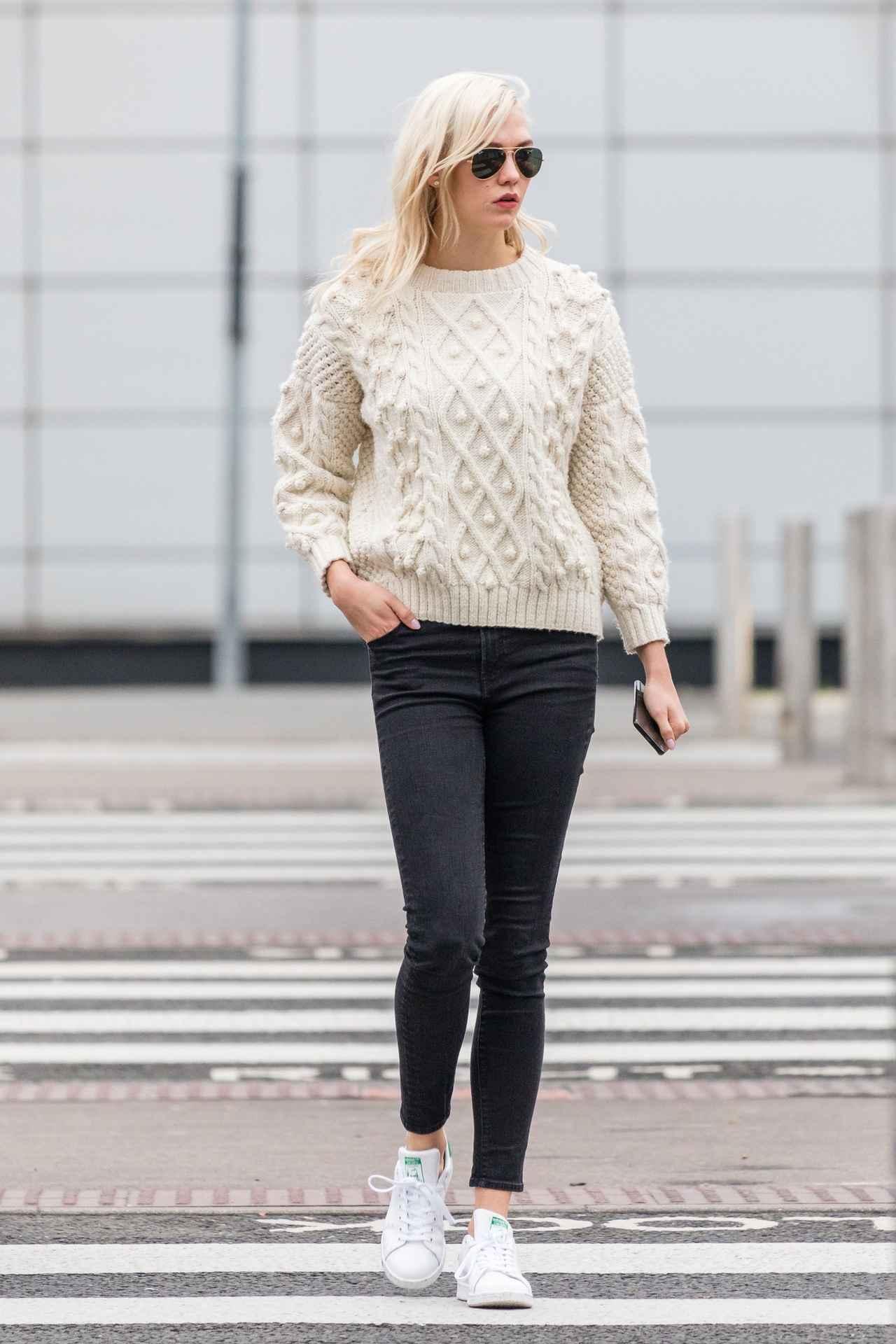 顔回りをパッと!キレイにみせてくれる白ニットは、暗くなりがちな冬のコーデに欠かせないアイテム。トップモデルのカーリー・クロスは、白ニットにスキニーデニムを合わせたカジュアルコーデの足元に、アディダスの白スニーカーをセット。白ニットに白スニーカーは好相性の組み合わせ!