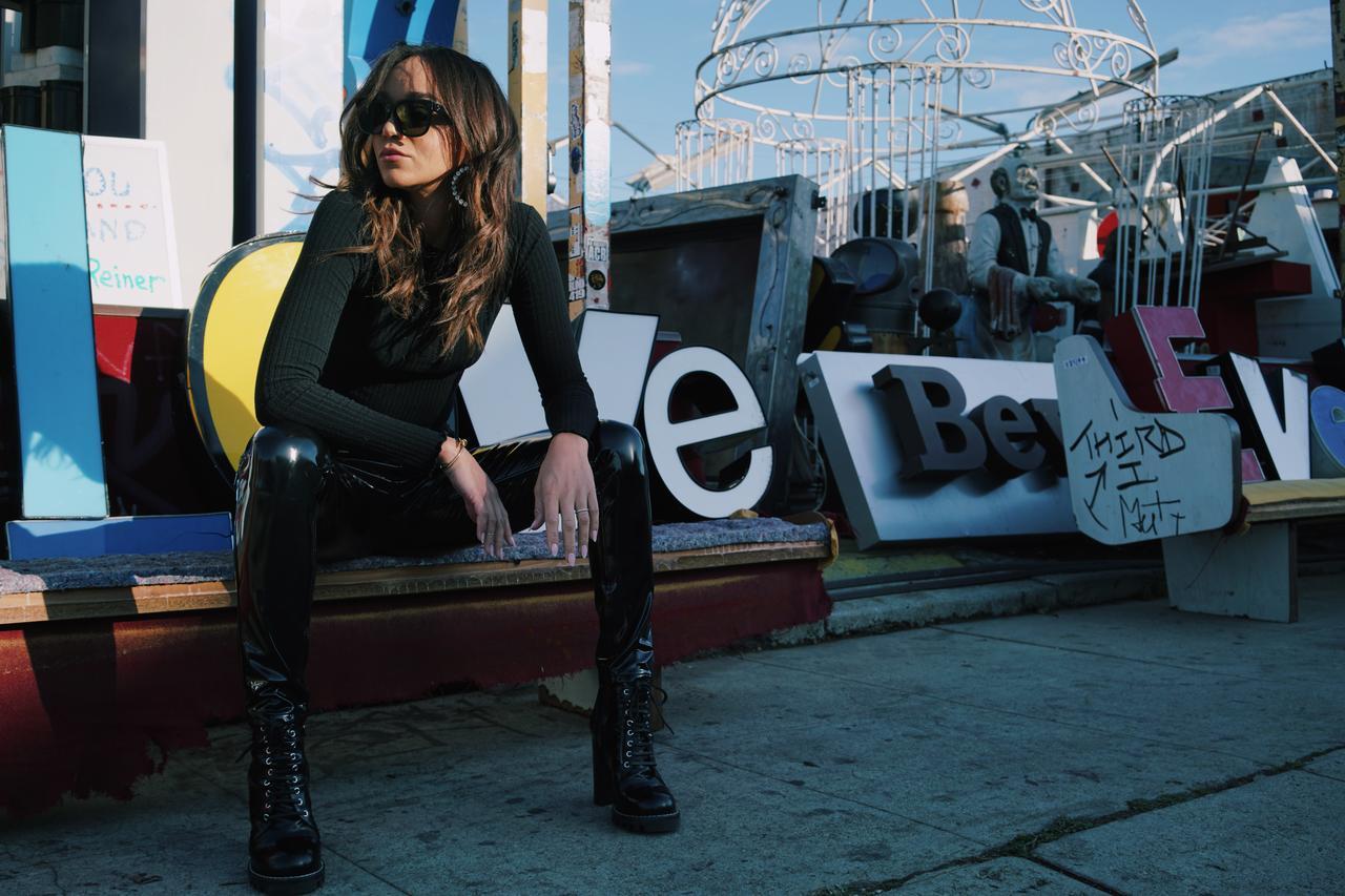 シンプルな黒のタートルネックに、光沢感のあるパンツを合わせ、レースアップブーツでクールにまとめた人気女優のアシュレイ・マデックウィ。同色を異素材で合わせて立体感を出すテクニックに注目!