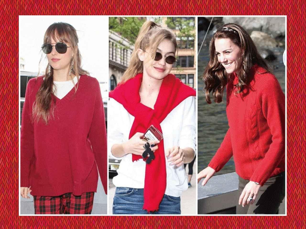 袖にデザインが入った赤ニットに、ライトブルーのデニムを合わせてカジュアルダウンさせた、女優のケイト・ボスワース。アイメイクとリップもレッド系で顔回りも華やかに飾って。