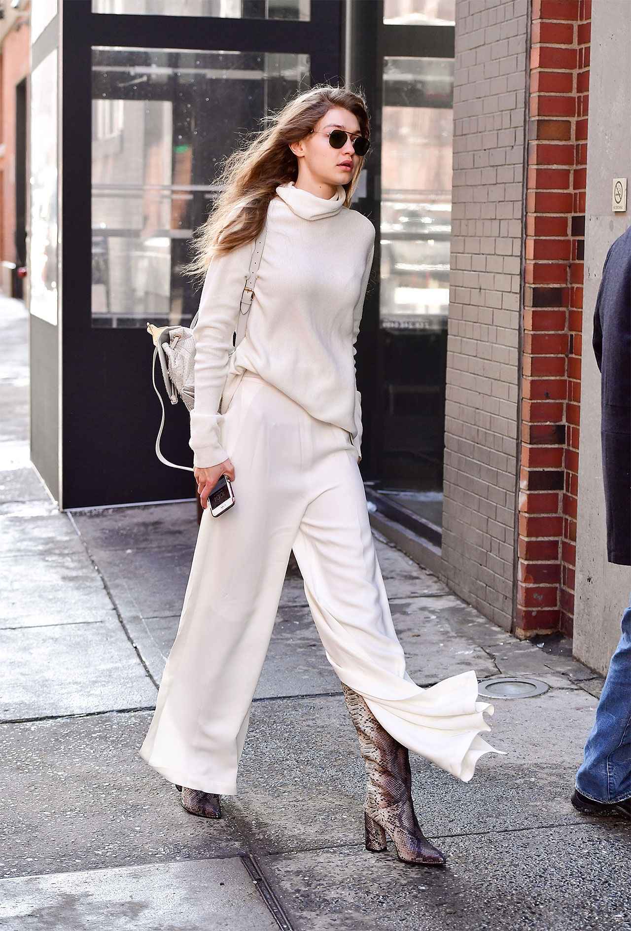 トップモデルのジジ・ハディッドは、シンプルな白のタートルニットに白パンツを合わせた、冬に映えるハイセンスなホワイトコーデ。