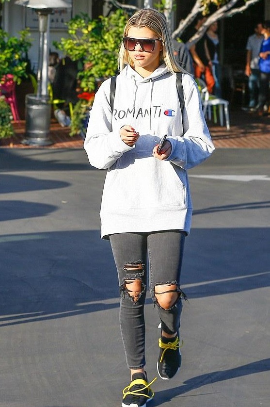 旬なモデルのソフィア・リッチーは、チャンピオンのフーディは大きめサイズを選び、J Brandのダメージデニムと合わせたストリートスタイル。