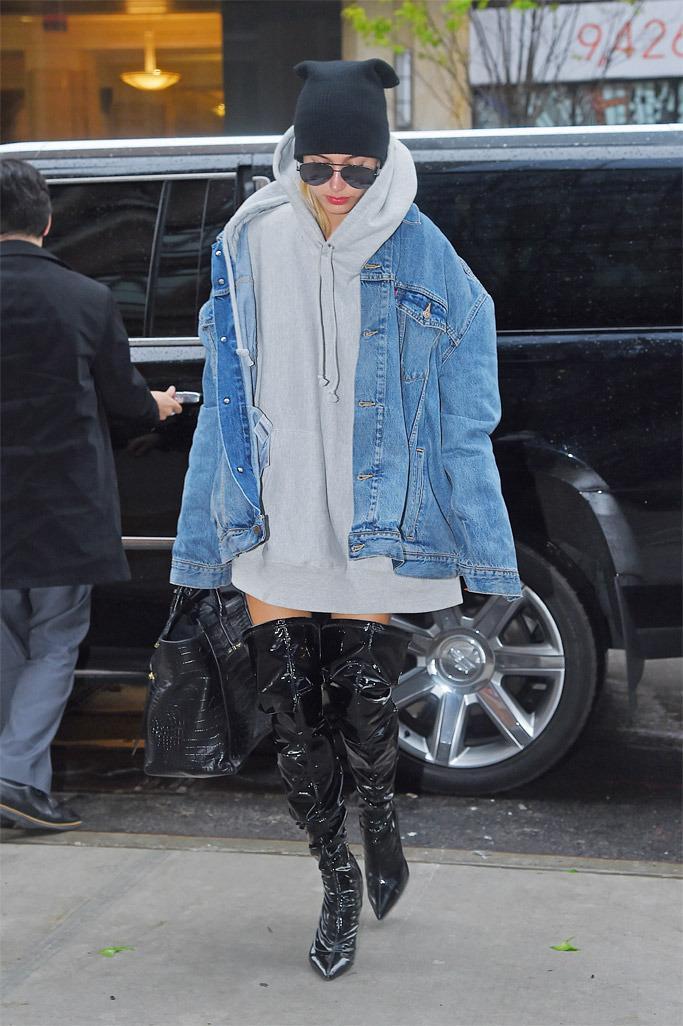 ジャスティン・ビーバーとの電撃結婚で話題のモデルのヘイリー・ビーバーは、チャンピオンのフーディを1枚でワンピのように着て、ヴェトモン×リーバイス(Vetements X Levi’s)がコラボしたオーバーサイズデニムジャケット を羽織った、旬なアーバン・ストリートスタイル。