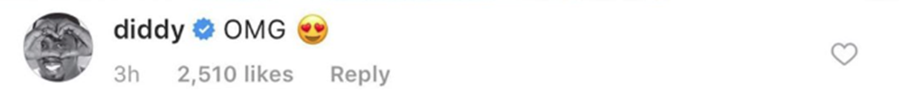 たったひと言ではあるが、驚きや感動を表す時によく使われる「オー・マイ・ゴッド(Oh My God)」の略語「OMG」に、目がハートになった絵文字を添えて元カノの美を称えたディディ。