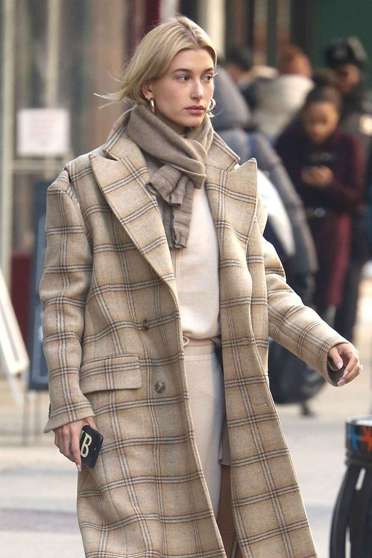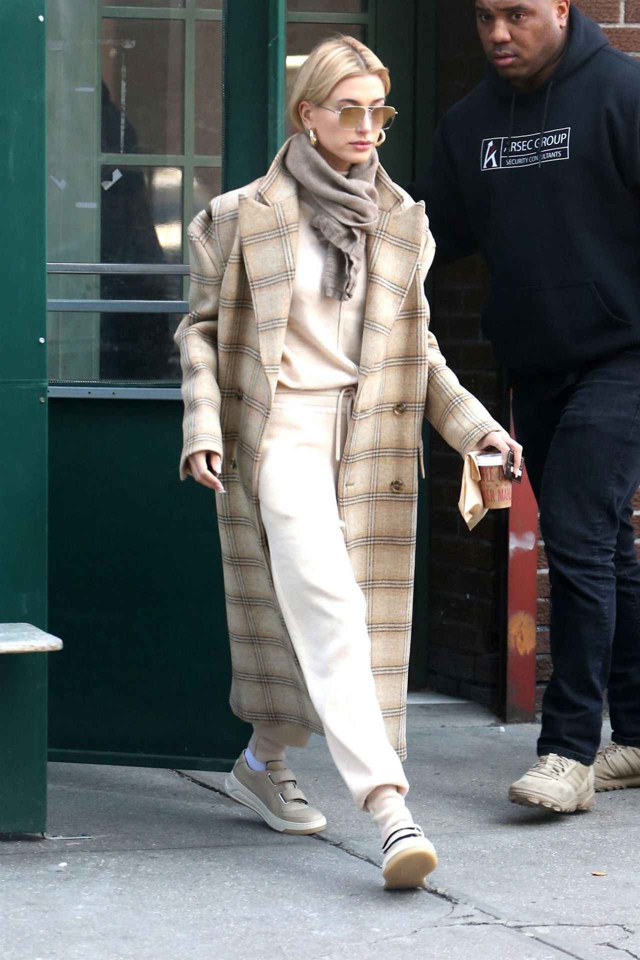 ベージュのジャージルックに、ベージュのチェックプリントのロングコートを羽織って同系色でまとめ、旬なワントーンコーデを作ったヘイリー・ビーバー。