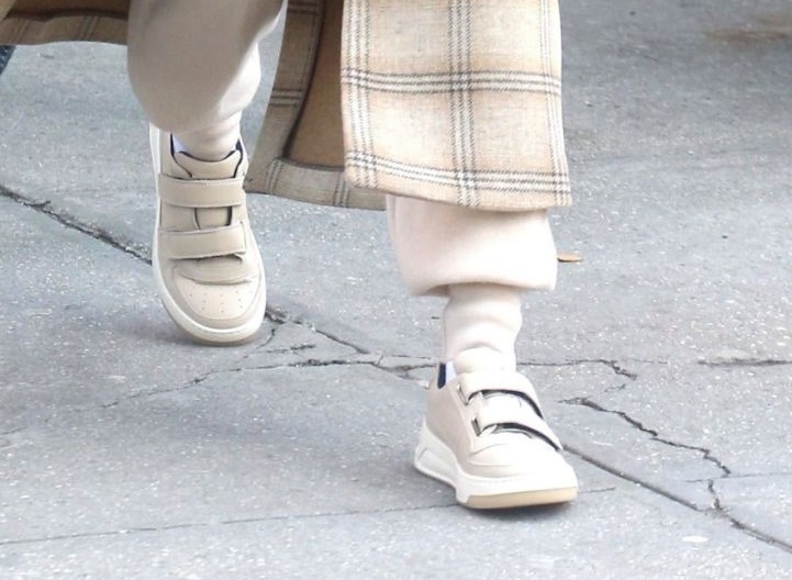 小物はマフラーとスニーカーもベージュ系で統一して。スニーカーはヘイリーの最近のお気に入りブランド、Acneのベルクロスニーカー。