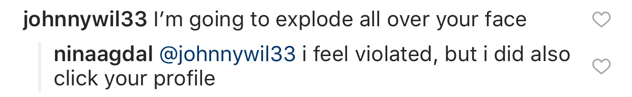 インスタグラムの規定があるため、大事な部分はキスマークの絵文字で隠されていたが、胸やお尻の形がはっきりとわかる過激写真にファンも大興奮。しかし、「キレイ」「美しい」といった賛美の声が多く上がった一方で、なかにはセクハラまがいのコメントを残す人も。そのうちのひとつにニーナが返したコメントが話題になっている。