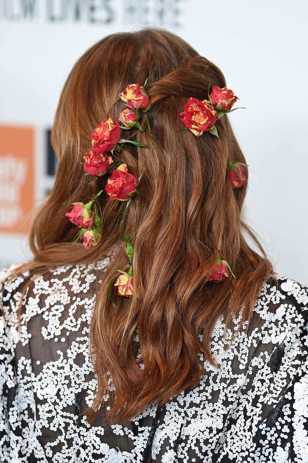 女優のエマ・ストーンは、サイドの髪からねじるようにして後頭部に止めていった髪に、花をランダムにさしていくヘアアレンジ。花の飾りは位置をずらして毛先にもゴムで止めて、甘すぎないおしゃれな仕上がり。