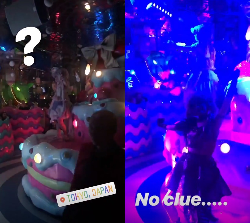 カフェ「KAWAII MONSTER CAFE HARAJUKU」にて。ストーリーにアップされた動画に添えられていた「?」と「さっぱりわからない…(No Clue)」というコメントからみて、パフォーマンスを理解するのに苦労した模様。