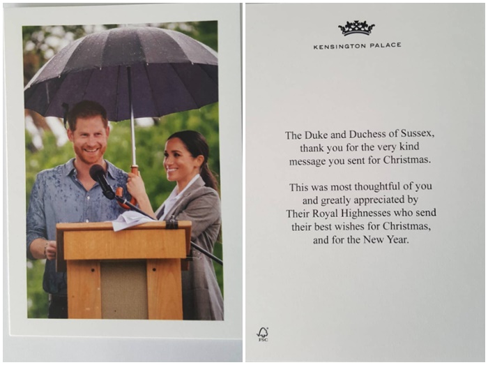 「サセックス公爵とサセックス公爵夫人は、あなたが送ってくださったクリスマスカードに書かれていた心温まるメッセージに大変感謝しております。あなたの思いやりに満ちあふれた行為に心からお礼を申し上げるとともに、クリスマスと新年があなたにとって最高のものになることを願っています」