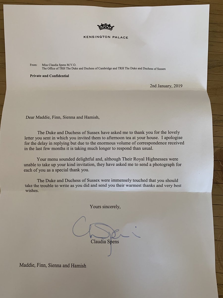 じつは、ヘンリー王子&メーガン妃から「手紙の返事が返ってきた」という話が出るのはこれが初めてではなく、先ほど話に出てきたオーストラリアを訪問中に2人を「ティーパーティー(お茶会)」に招待した現地の子供たちのもとにも、「残念ながらパーティーには行けませんが、みなさんに写真を差し上げるよう2人(ヘンリー王子&メーガン妃)から言付かりました」という内容の手紙がケンジントン宮殿から送られてきたことがある。