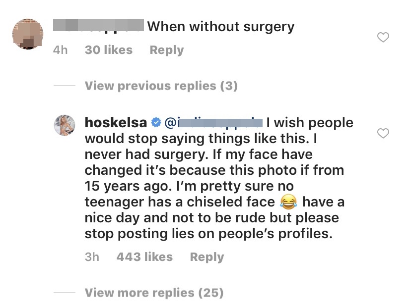 「こういうことを言うのはやめてほしい。整形したことはありません。私の顔が変わったというなら、それはこの写真が15年前のものだからです。彫りの深い顔をしている10代なんていないと思うけど。失礼な態度を取らないで良い1日を過ごしください。人のプロフィールに嘘を書かないでください」