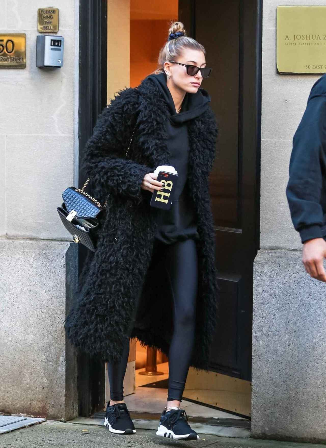 旬なモコモコ素材のコートを羽織って、エステサロンから出てきたところをキャッチされた、人気モデルのヘイリー・ビーバー。