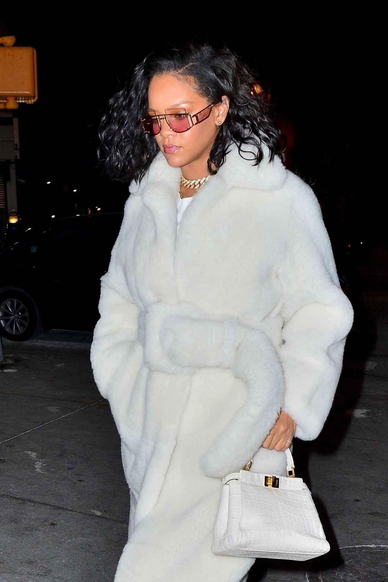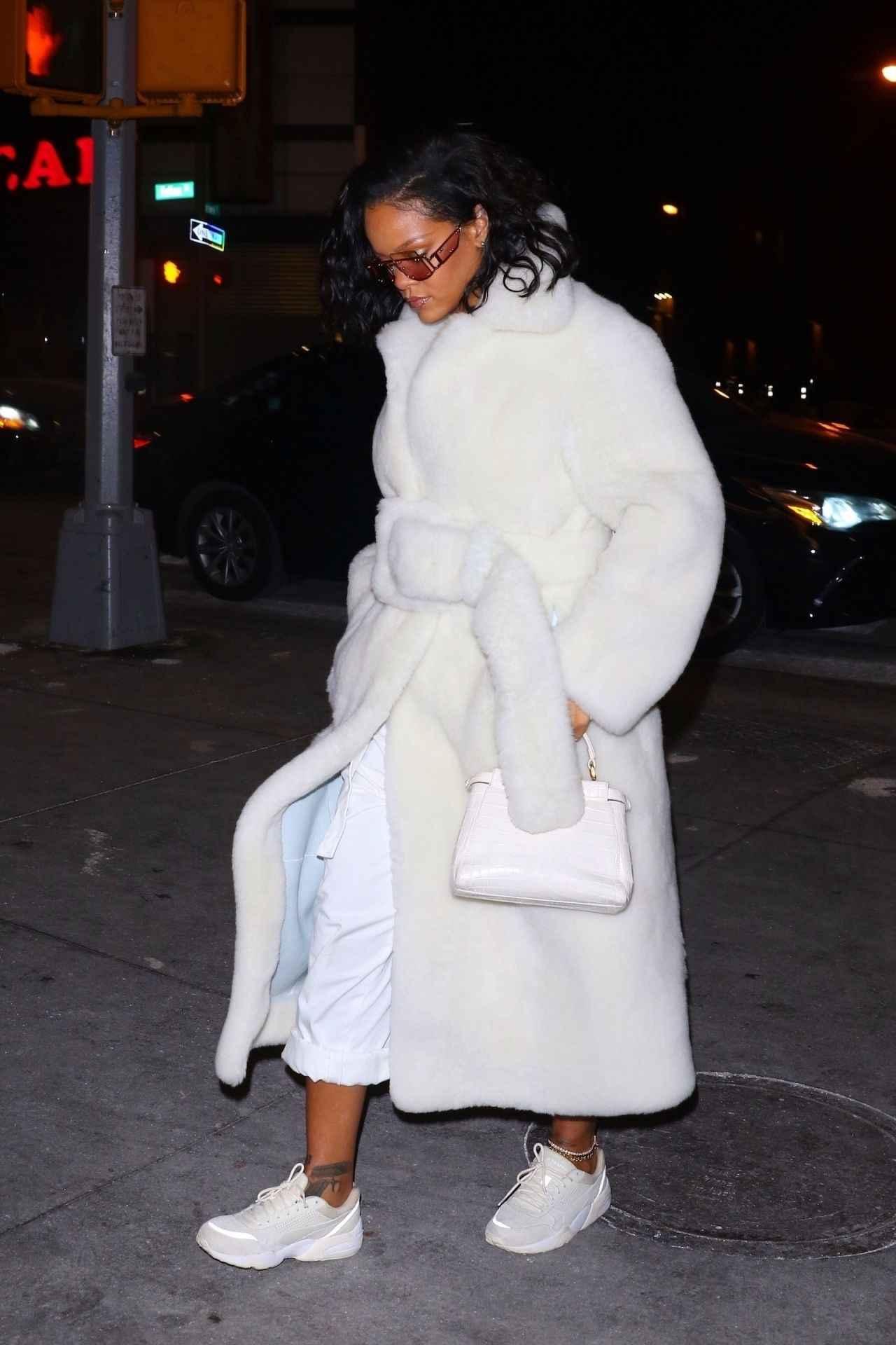 フェンディ(Fendi)のバッグも白で統一して、旬な冬のオールホワイトコーデを披露。エレガントなバッグやコートをスニーカーで着崩した、リアーナらしいモードなストリートスタイルを作って。