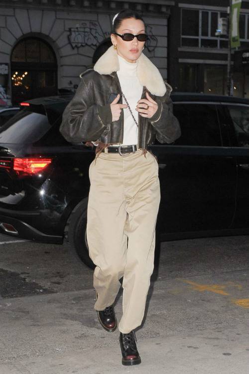 ファッション界からも大人気な旬モデルのベラ・ハディッドは、ディッキーズのワークパンツに、ショート丈のレザージャケットを合わせ、足元はドクターマーチン(Dr. Martens)のブーツでボーイッシュに仕上げて。