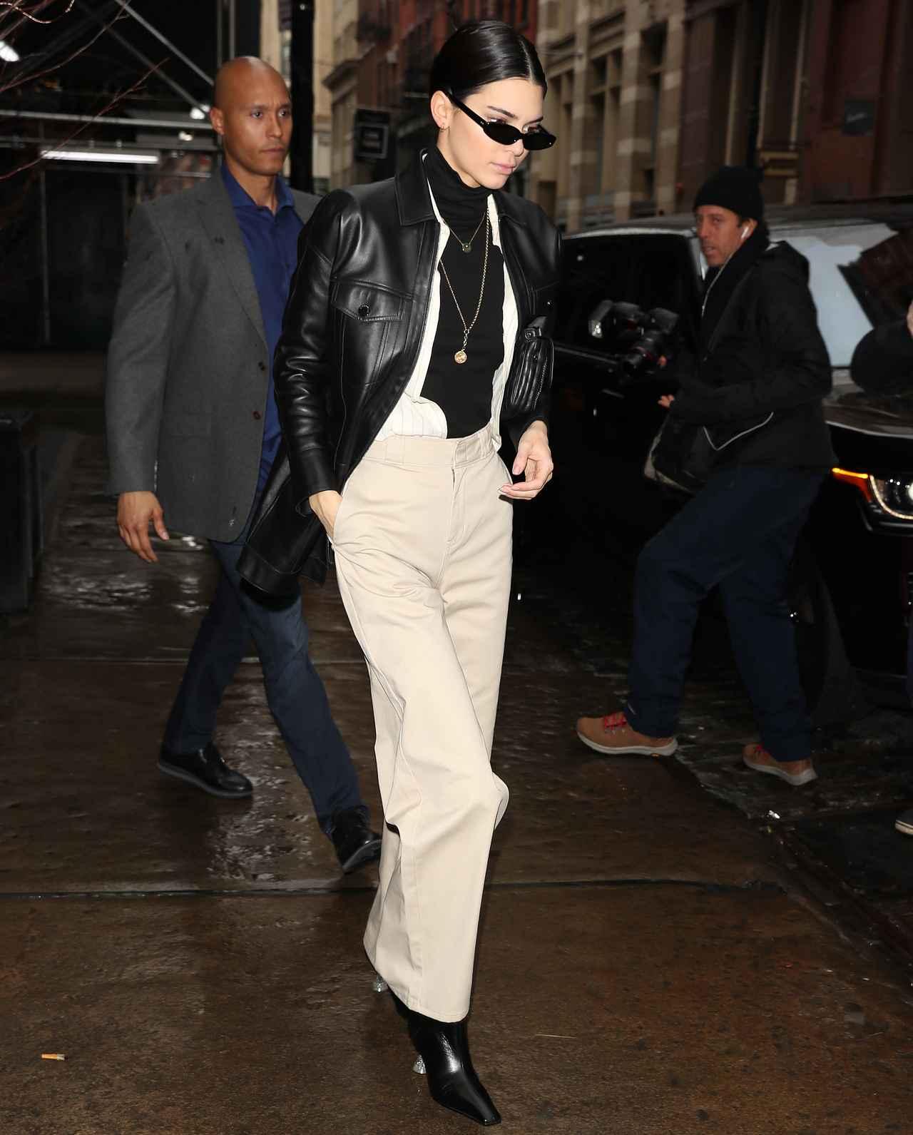 デッキーズのワークパンツにレザージャケットを合わせ、スキニーサングラスでスパイスをつけた、人気モデルのケンダル・ジェンナー。