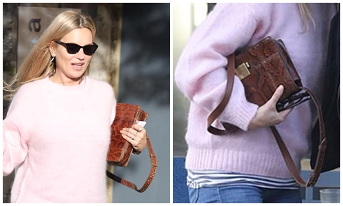 ライトピンクのニット+デニムという大人カジュアルなルックに、セリーヌのクラシックボックスバッグを合わせ、品よく格上げルックに仕上げたトップモデルのケイト・モス。