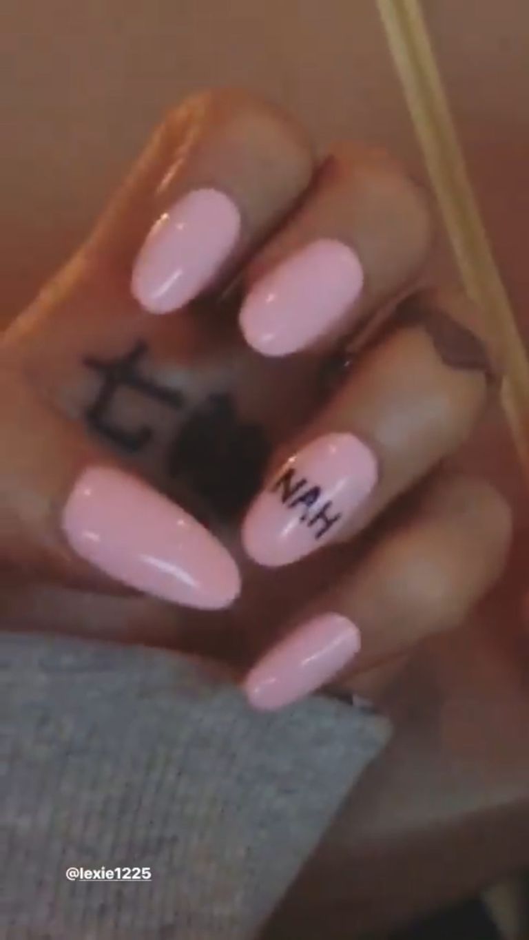 すると、アリアナのアイシーなペールピンク一色でカラーされたネイルの左手薬指の爪には、「NAH(ナー)」(※)の文字が。