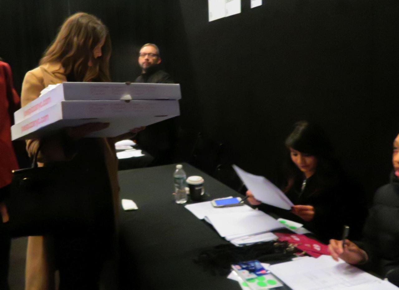 片時もピザを離さなかったテイラーは、モデルにとって大事なショーの前に巨大なピザを持参し度肝を抜かせた。(フロントロウ編集部)
