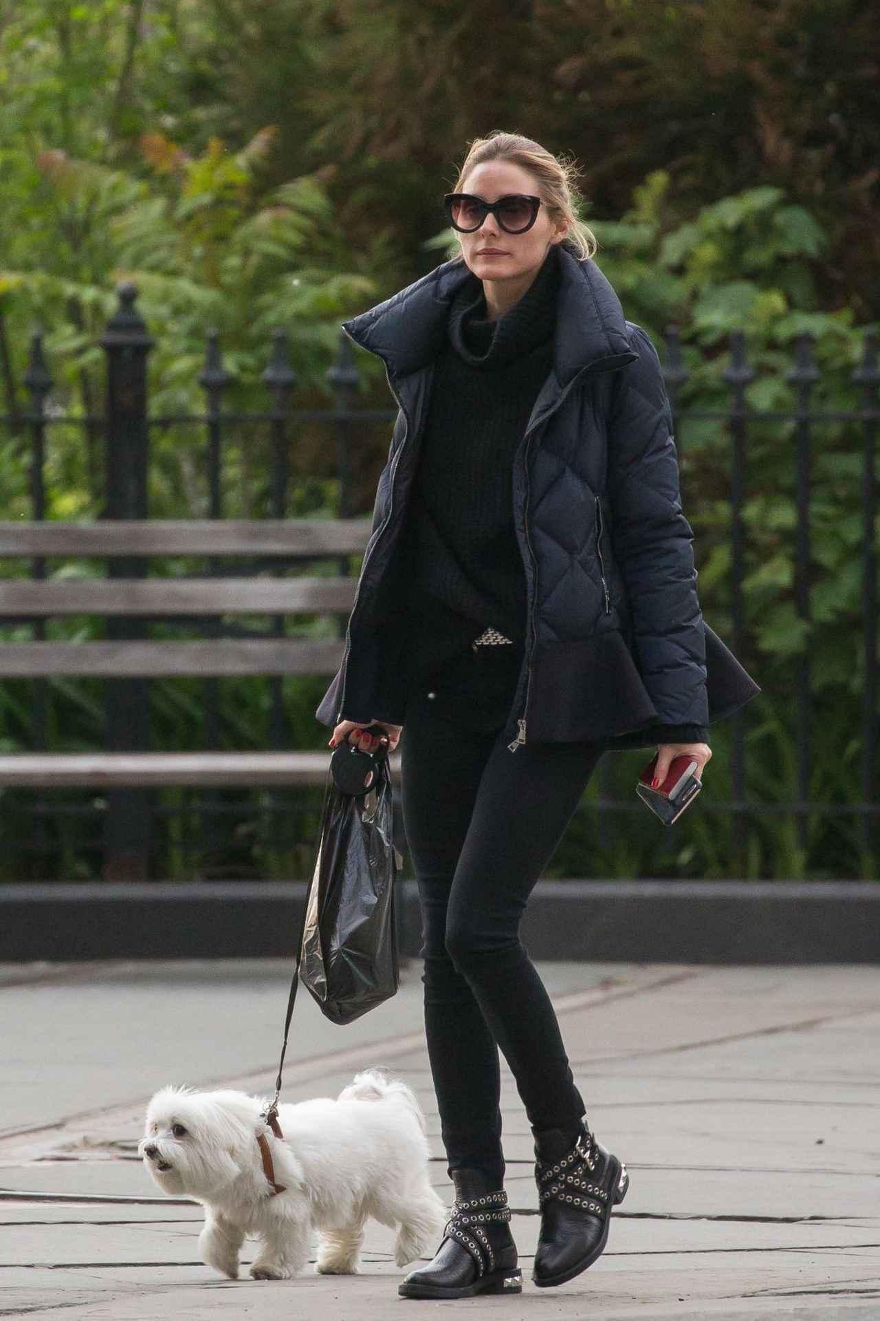 愛犬の散歩に出かけた人気ファッショニスタのオリヴィア・パレルモは、モンクレールのダウンに、スキニーデニムを合わせたブラックコーデに、ミュウミュウ (Miu Miu)のスタッズブーツでアクセントをつけて。