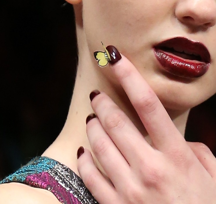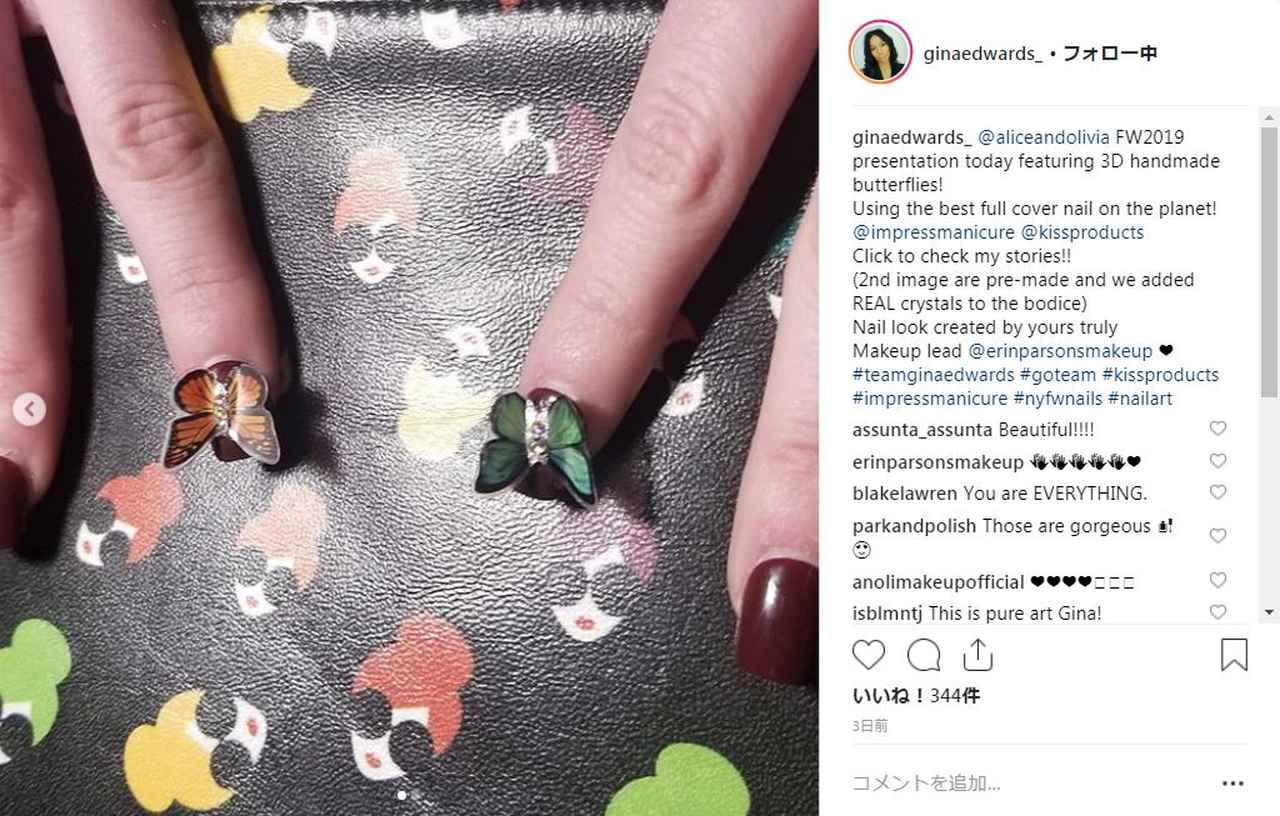 2月に開催のNYファッション・ウィークでは2019年秋冬コレクションが披露されているけれど、ブランド「alice + olivia(アリス アンド オリビア)」のショーでの立体的な蝶のネイルがかわいいと話題になっている。(フロントロウ編集部)