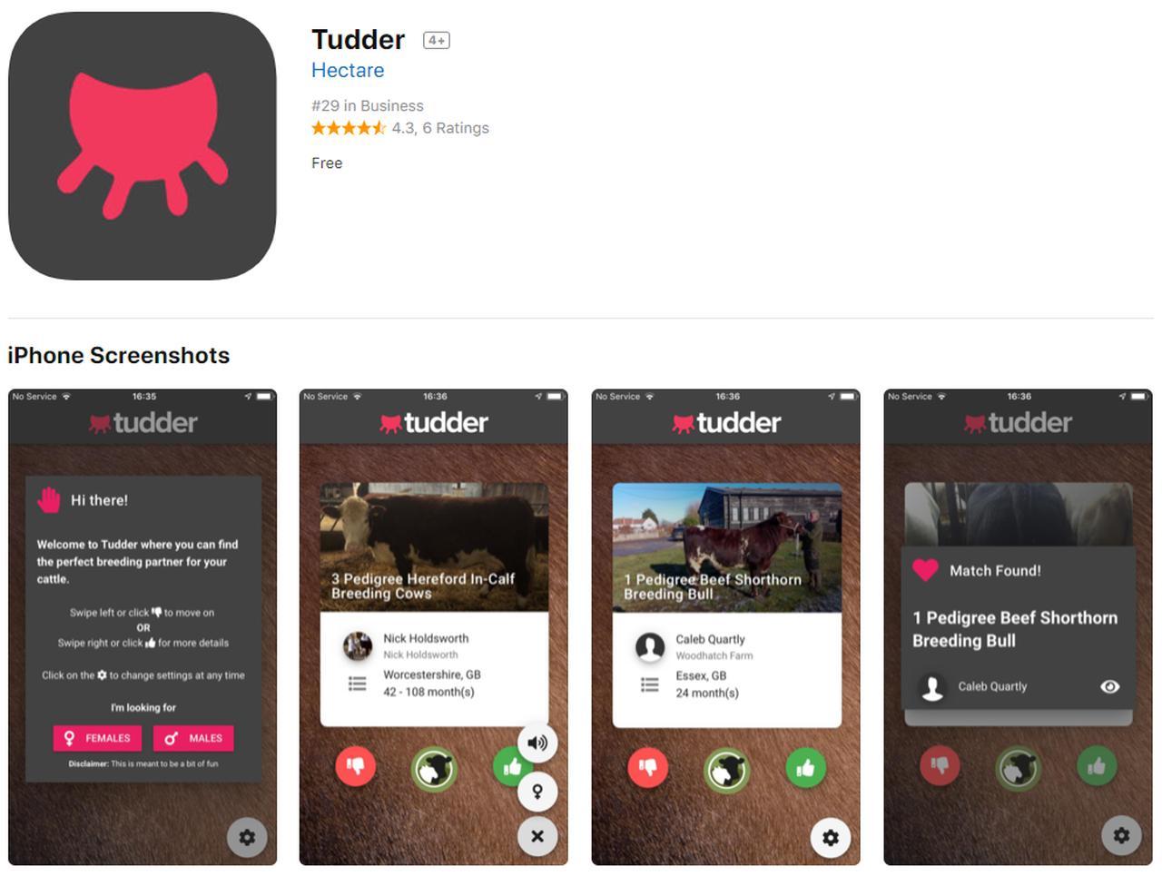 イギリスの家畜の売買を行なっている会社ヘクタールが開発したそのアプリの名前は、ティンダー(Tinder)ならぬタダー(Tudder)。ヘクタールは、このプロジェクトのために約4億円以上の資金を獲得。なんとその出資者には、イギリス政府やテニス選手のアンディ・マリーなどが含まれるそう。