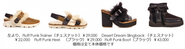 ロックンロール・テイストのフラッフ パンク(Fluff Punk)は、ツインフェイスシープスキンやレザー、カーフヘアー、ソフトレザーなどを用い、ヒールやスニーカー、ブーツなどのシルエットに完璧にマッチさせている。