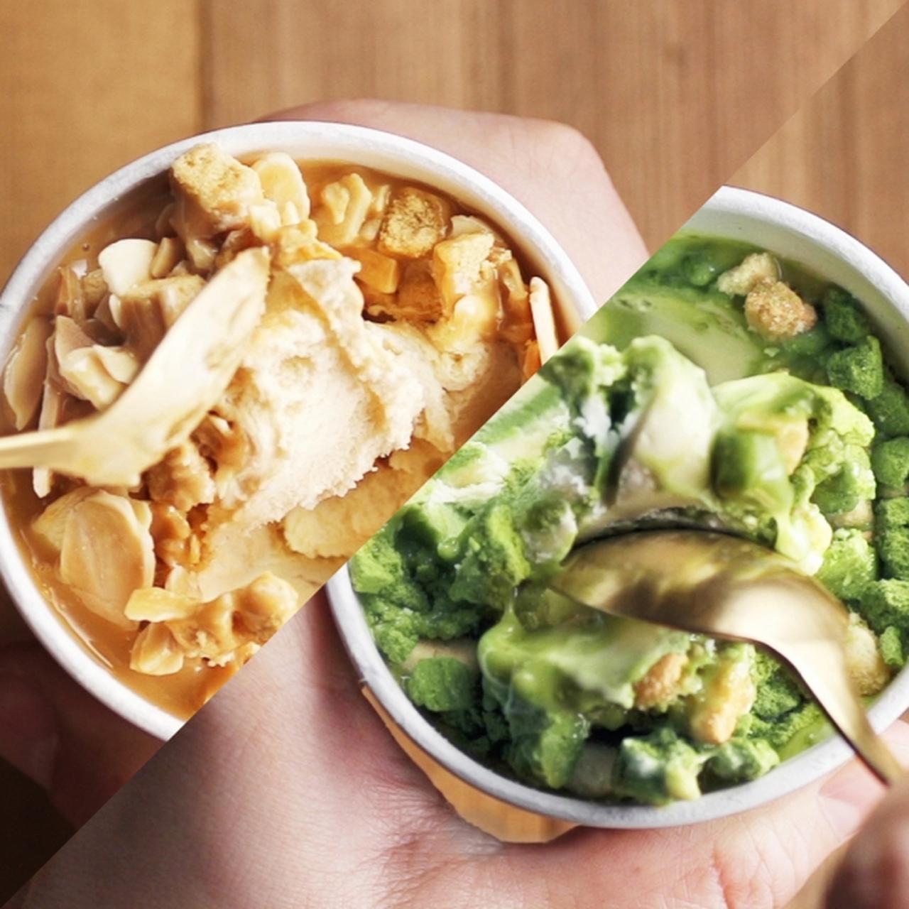カップ3分の2位までの深さにスプーンが入るようになったら、食感の異なる2種類のトッピングとアイスクリーム全体を“ざくざく” “まぜまぜ”。“まぜ食べ“することでさらにトッピングの食感が際立つ。