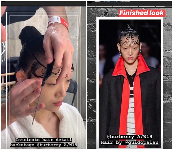 そんなバーバリーのコレクションのランウェイを歩いたモデルたちのヘアスタイルに注目。今回のコレクションでは4種類のヘアアレンジがお披露目されたが、なかでも大きな話題になったのは、顔周りに髪の毛で絵を描いたようなデコラティヴなヘアスタイル。