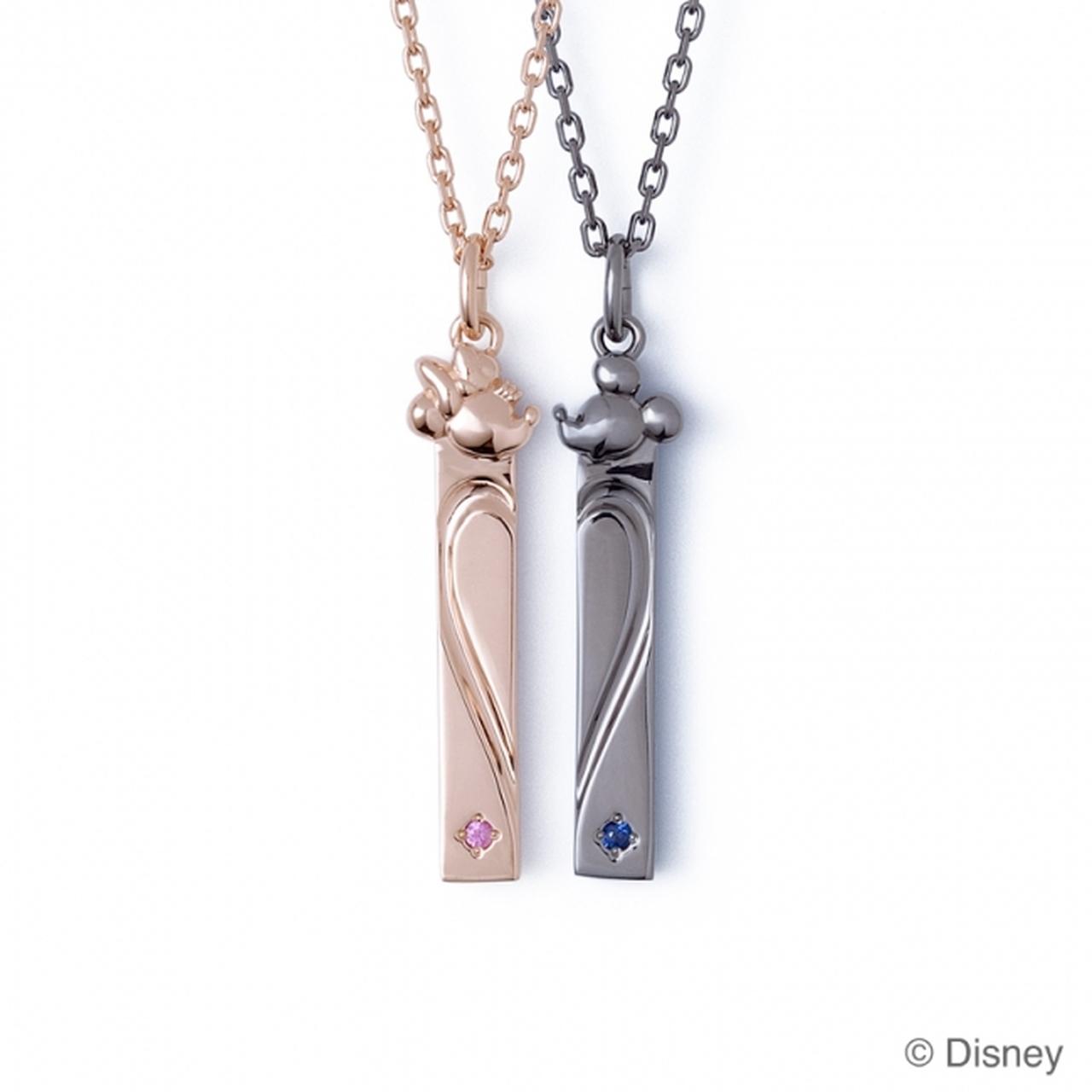 ふたつでひとつのハートを描くDUETシリーズのペアネックレス。レディースとメンズのネックレスを近づけると、ミッキーとミニーが鼻でKISSをするキュートなデザイン。それぞれにセットされたピンクサファイア、ブルーサファイアが華やかさをプラスしてくれる。