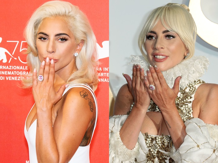 クリスチャンから贈られた指輪を着用していた頃のガガ。巨大なピンクサファイアに、ダイヤモンドがラウンドセッティングされたこの指輪の値段は4,000万円を超えると報じられた。