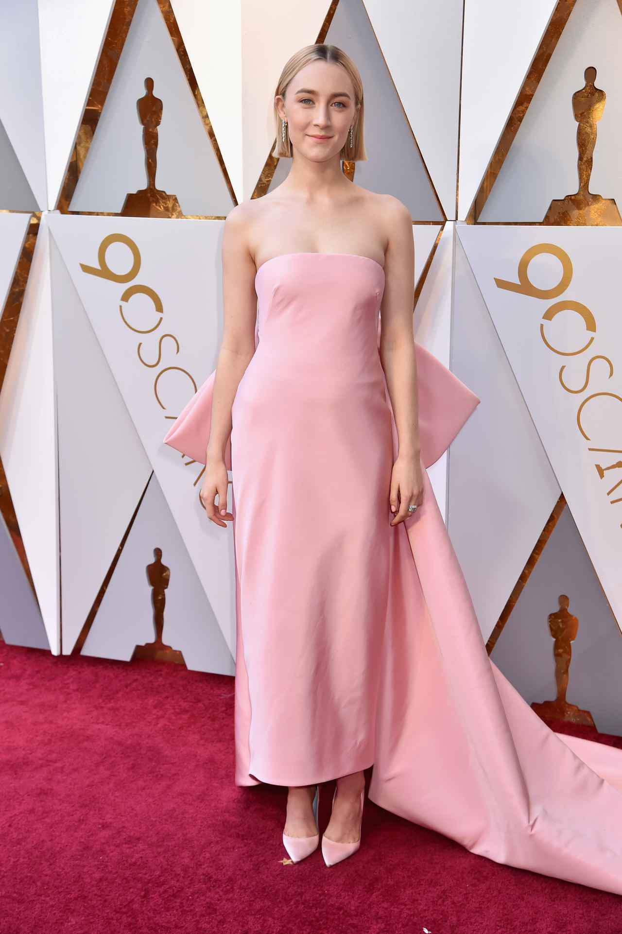シアーシャ・ローナンは、雰囲気にぴったりなベビーピンクのドレスを着用。シンプルに見えがちだけれど、じつは後ろには長いトレーンと大きなリボンが施されており、かなり華やか。ちなみにこのCALVIN KLEIN(カルバン・クライン)のドレスは、アフターパーティーでも着用しており、アフターパーティーでは長いトレーンが取り外されスッキリとした印象だった。