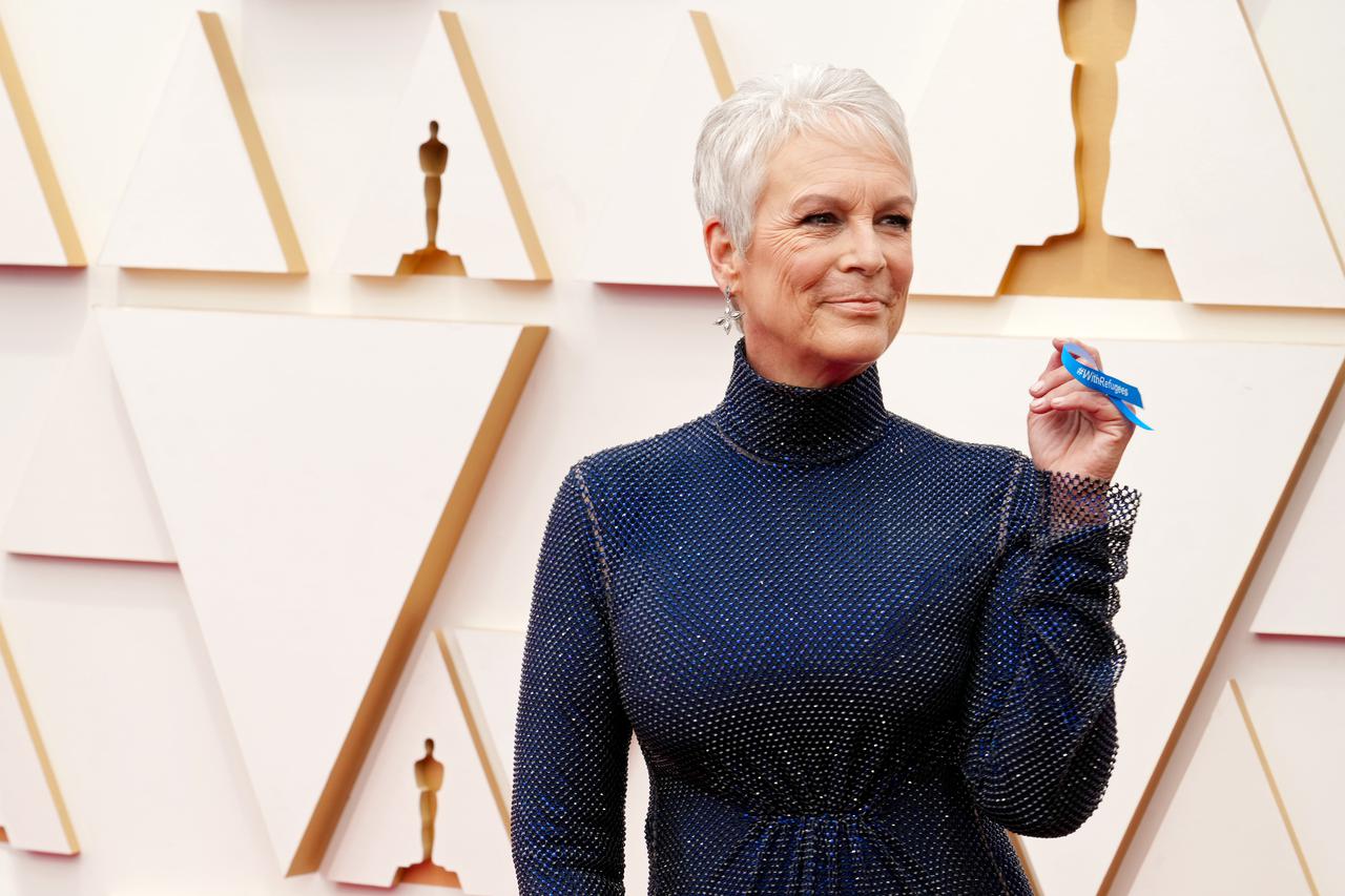 ジェイミー・リー・カーティスは、ウクライナから逃れた難民たちへのサポートを示す、青いリボンを自身の左手の指に巻いて。