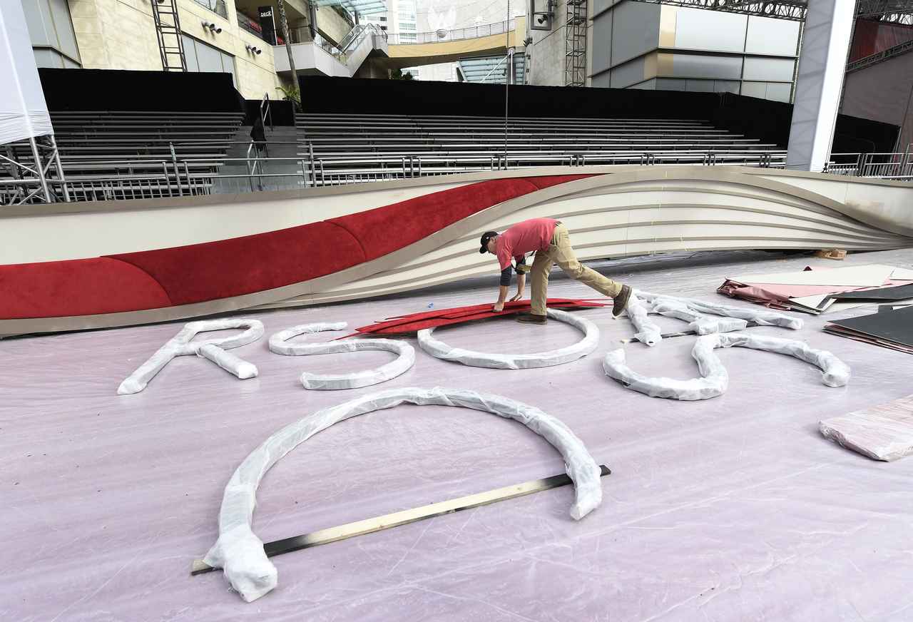 20日、ドルビー・シアターでアカデミー賞授賞式の準備を進めるスタッフ。