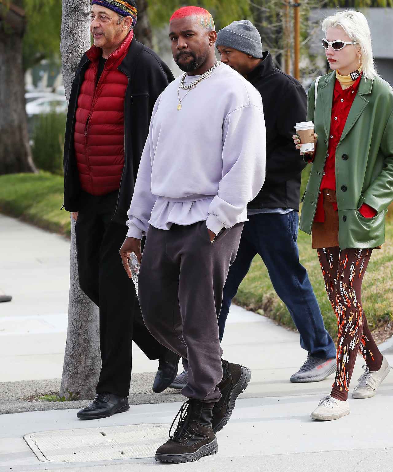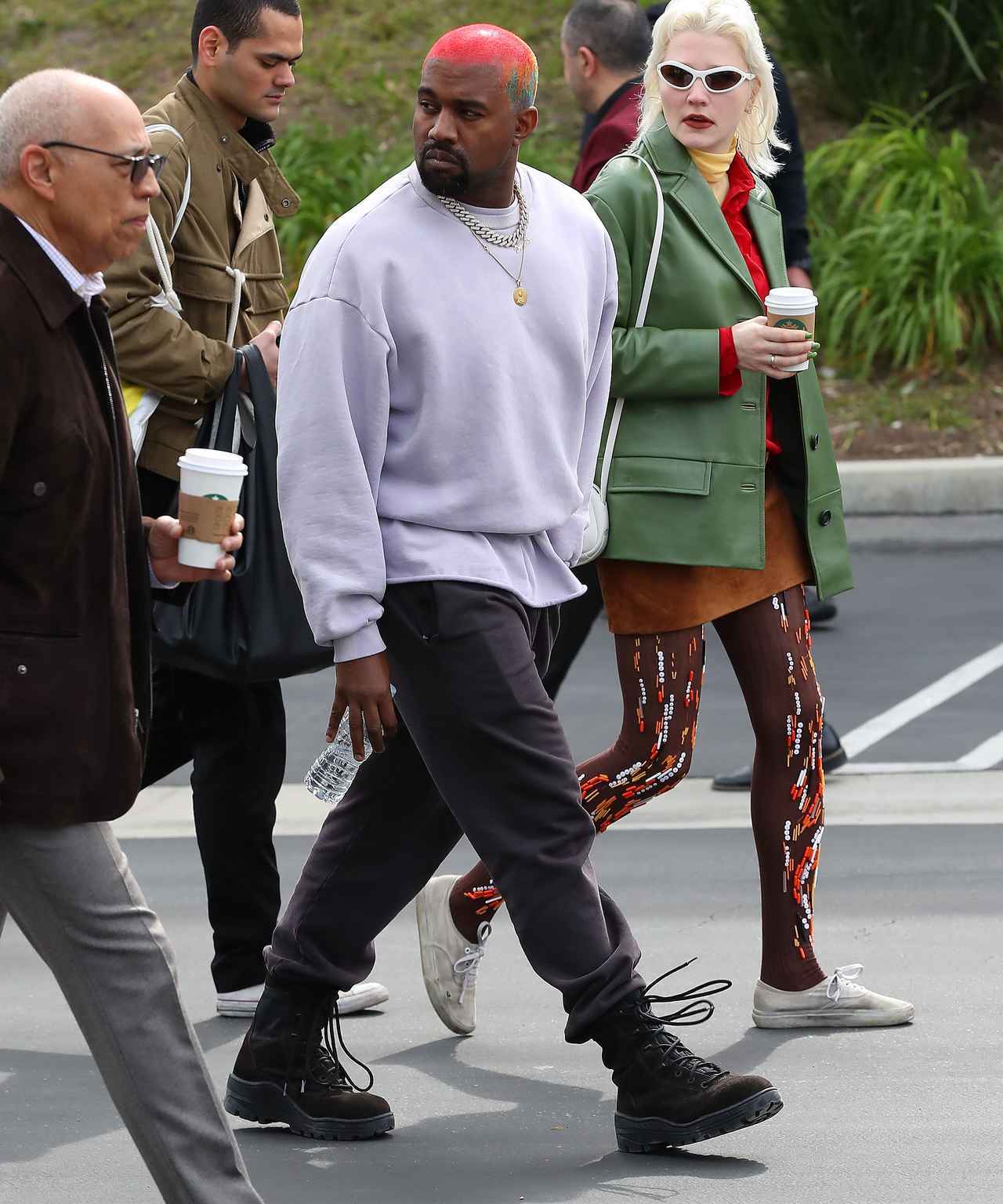 圧倒的な存在感を放つカニエのニューヘアカラー。果たしてこのカラーはいつまで続くのか。(フロントロウ編集部)