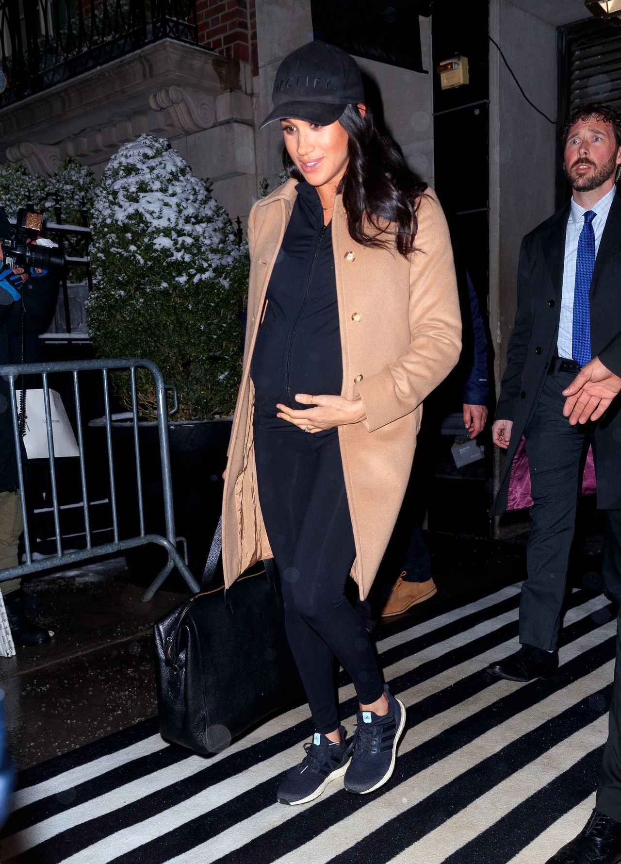 帰国の日、コート以外のアイテムをオールブラックでそろえたメーガン妃は、レギンスにスニーカーを合わせたプリンセス感“ゼロ”の超カジュアルファッションで空港へ。